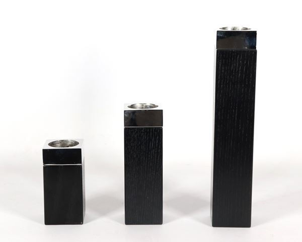 Lot of three candle holders in ebonized wood and silver metal