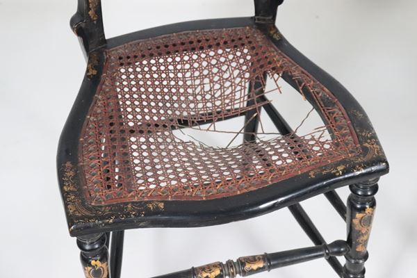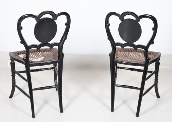 Pair of ebonized wooden chairs with mother-of-pearl inlays and golden floral scrolls