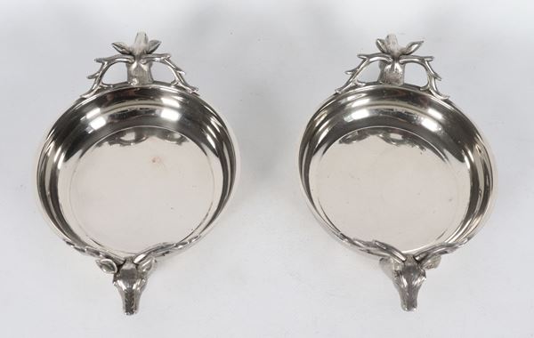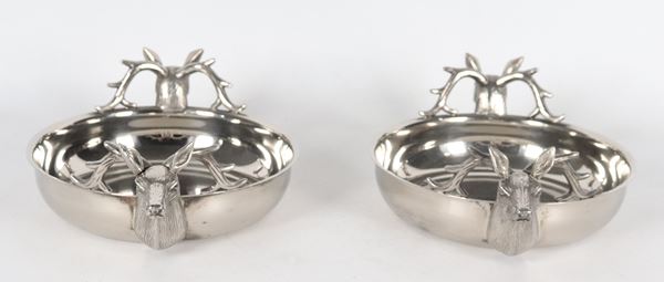 Pair of small silver metal game pans with deer heads