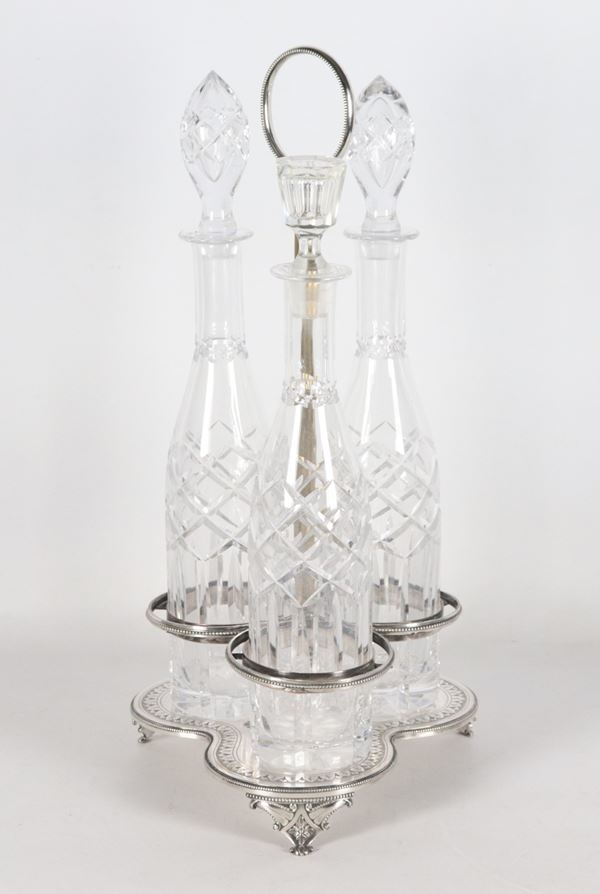 cm 22 x 22 x 46 hclover-shaped and supported by three curved feet, diamond-pointed bottles, one with a different cap