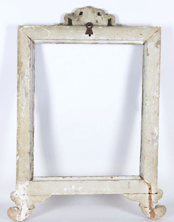 Antique frame in light blue lacquered wood with carved and gilded friezes