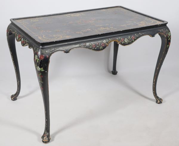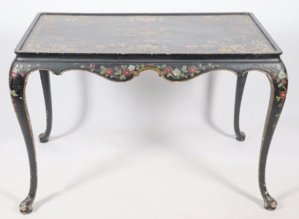 with polychrome and gilded decorations with floral scrolls and bunches of flowers, four curved legs, 93 x 56 x 58 h cm.
