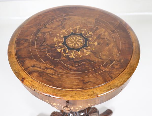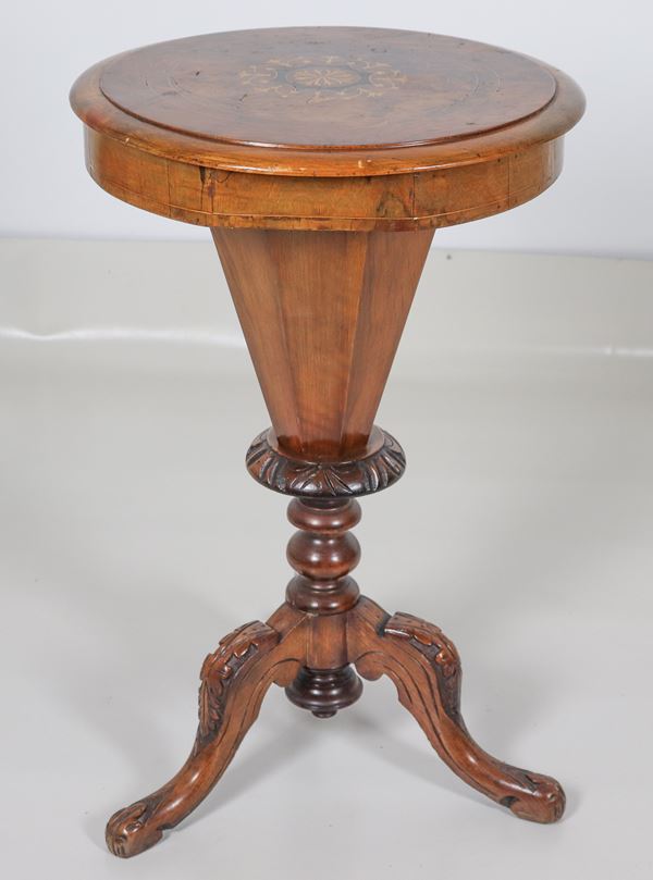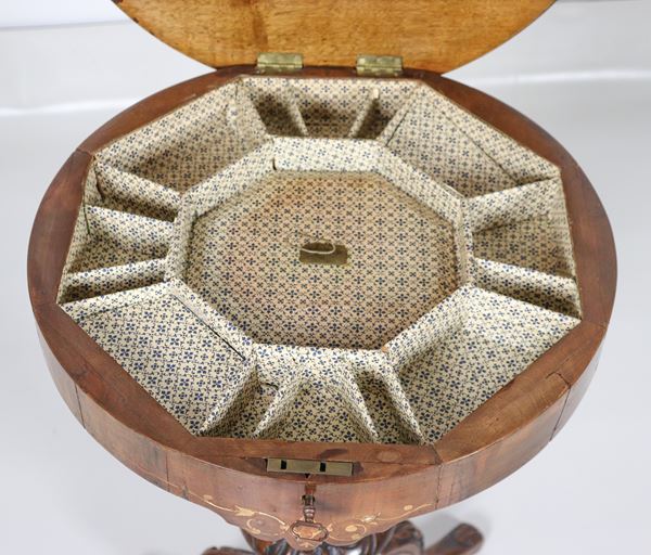 with opening inlaid top and compartments inside, turned column base resting on three curved legs, 46 x 46 x 74 h cm.