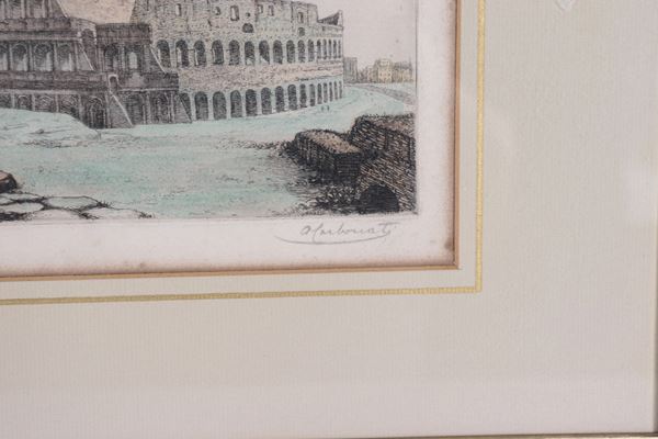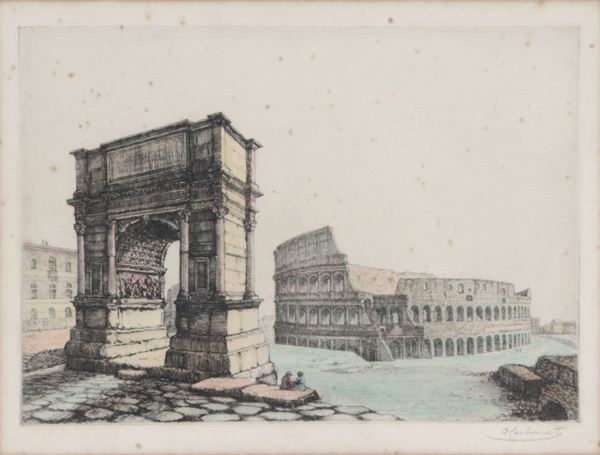 Signed. "View of the Colosseum and the Arch of Titus"