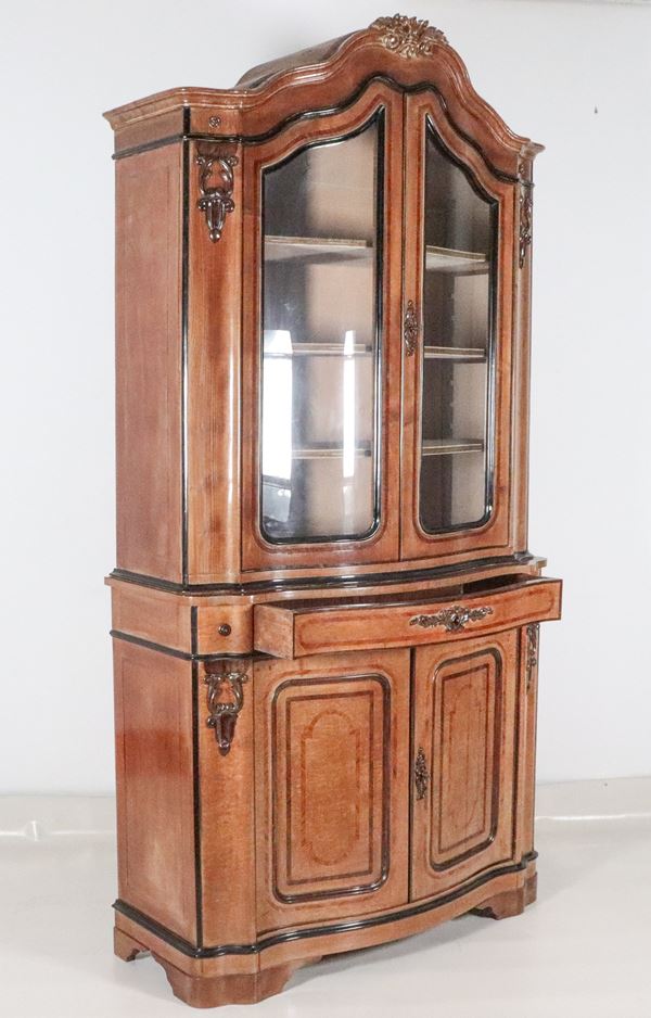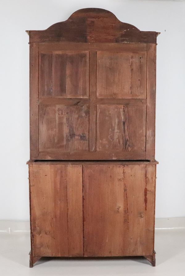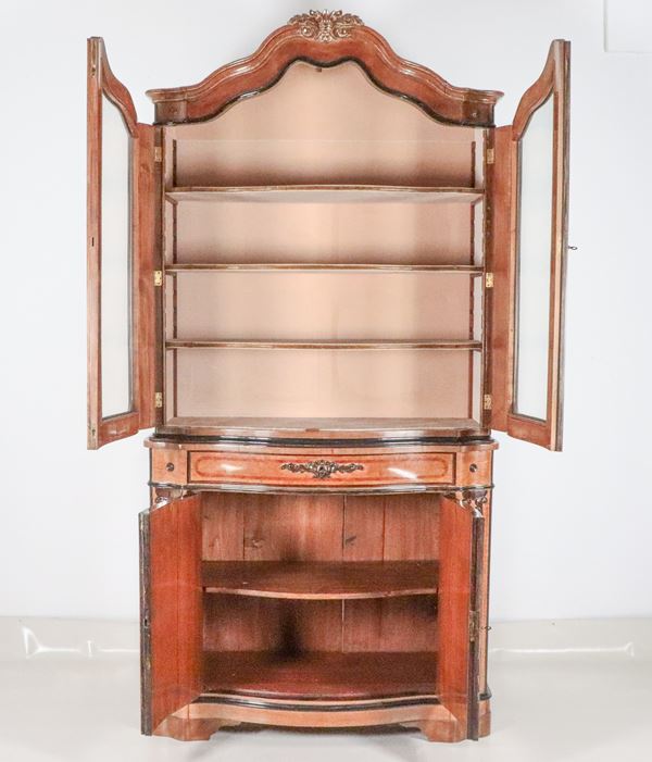 the upper part with two glass doors and shaped top, the lower part with central drawer and two panelled doors underneath, 123 x 51 x 249 cm h.