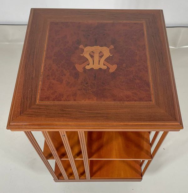 with top inlaid with thread motifs and trumpets with lyre in the centre, square shape with compartments underneath, 48 x 81 cm.