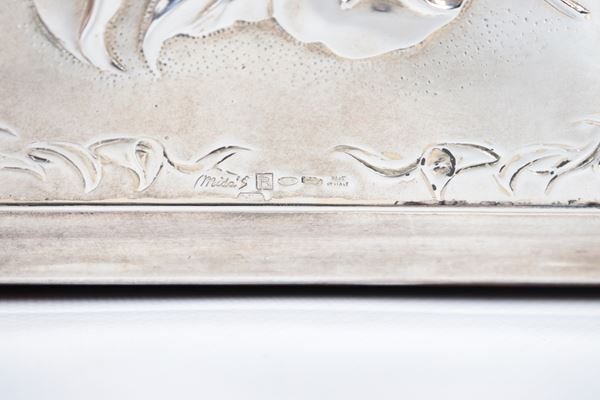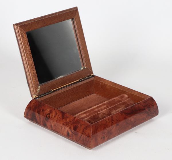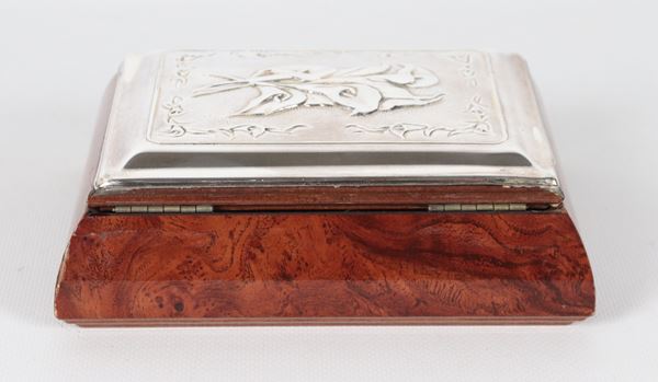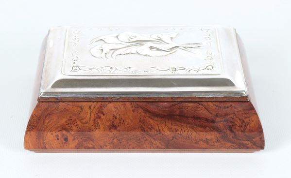 Jewelry box in briar root, on the lid a silver cover with floral motif
