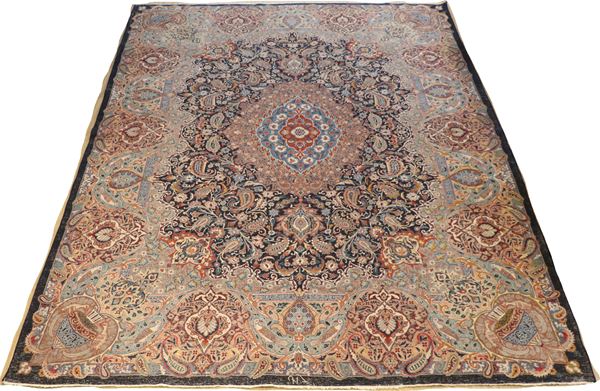 Large Persian Kashan carpet with floral designs and central rosette on a blue and brown background, M. 3.85 x 2.95