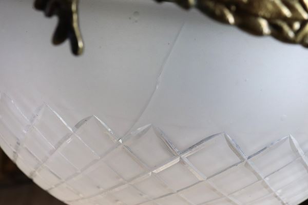 with central globe in worked glass and three pendant lights. The globe has a crack, diameter cm 47 x 103 h.