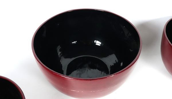 Lot of four round bowls of various sizes in red and black lacquered wood