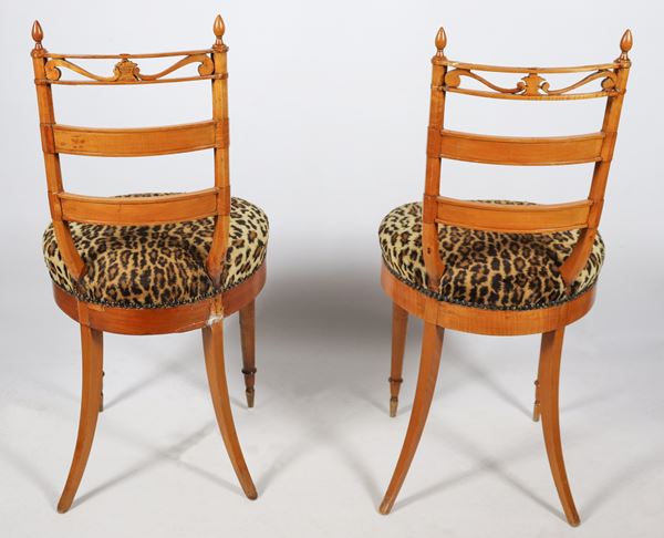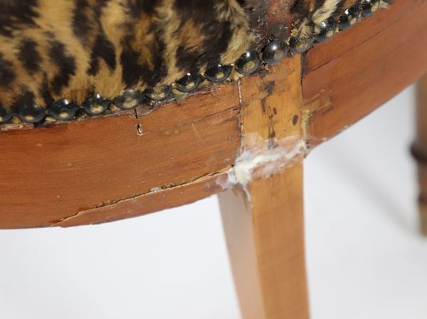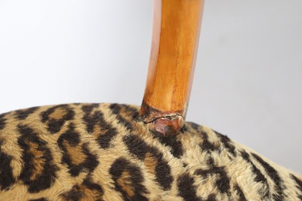 with carved and turned backs and legs, leopard print fabric covering. Various defects, 40 x 37 x 86 h cm each.