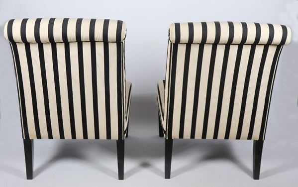 Pair of French armchairs with black lacquered wooden legs and striped fabric covering