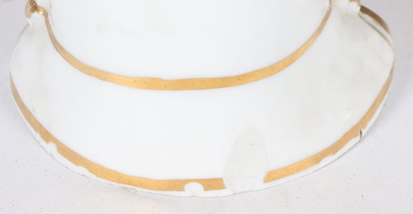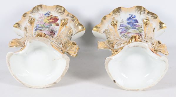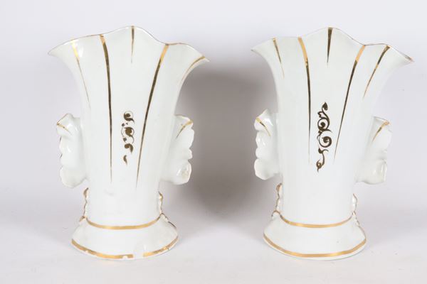 in white porcelain with polychrome decorations of bunches of flowers and highlights in pure gold. One vase has a reglued break, 26 x 15 x 32 h cm each.