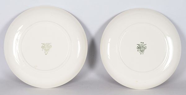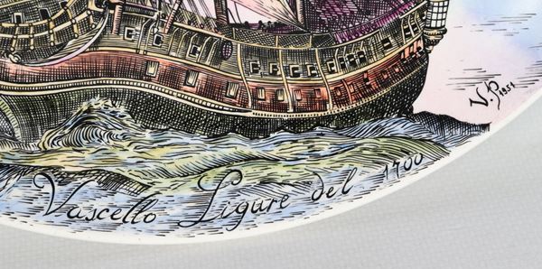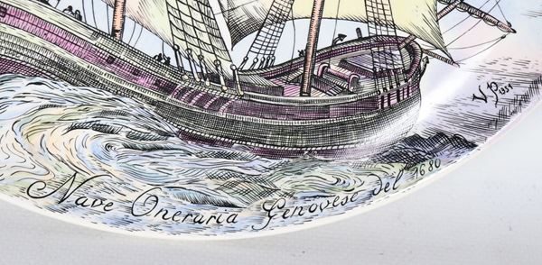 Pair of porcelain and enamelled ceramic plates with decorations of ancient sailing ships