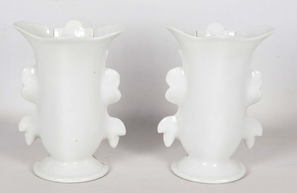 Pair of small Neapolitan vases in white porcelain with polychrome floral decorations