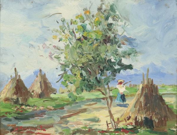 Signed. "Peasant woman with sheaves of wheat"
