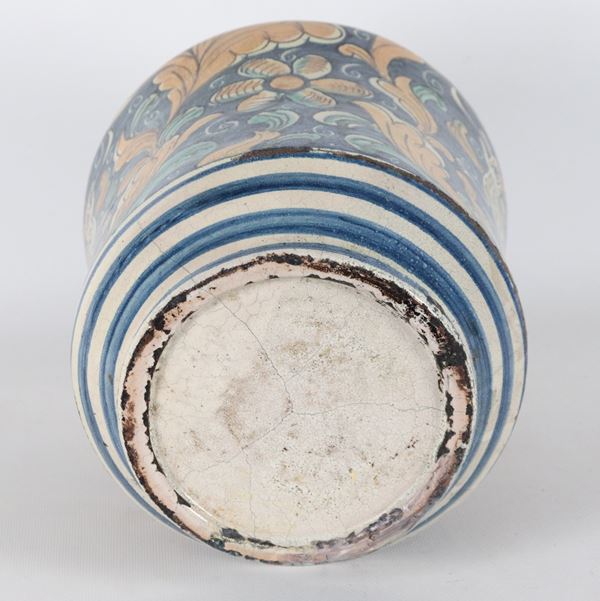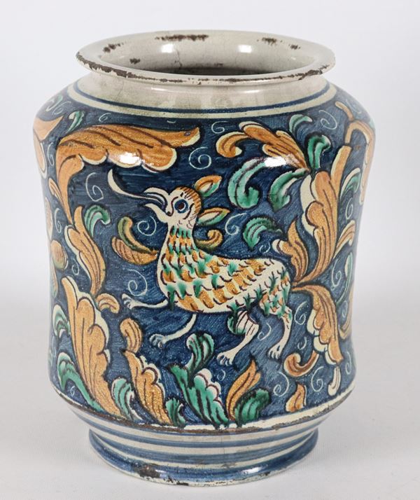 Large glazed Caltagirone majolica jar with polychrome foliage and mythological animal decorations