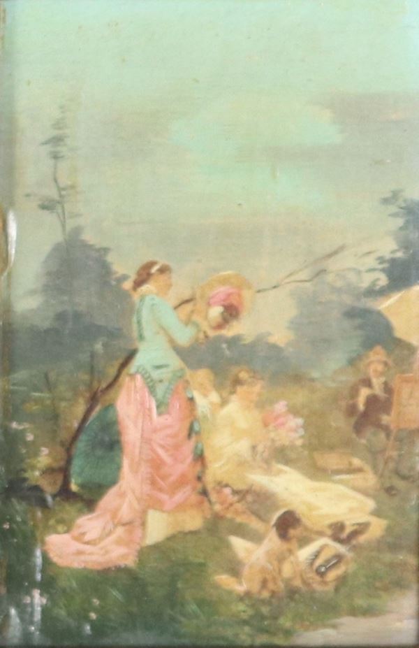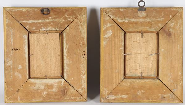pair of small oil paintings on panelantique gilded and carved wooden frames, 14 x 10 cm each.