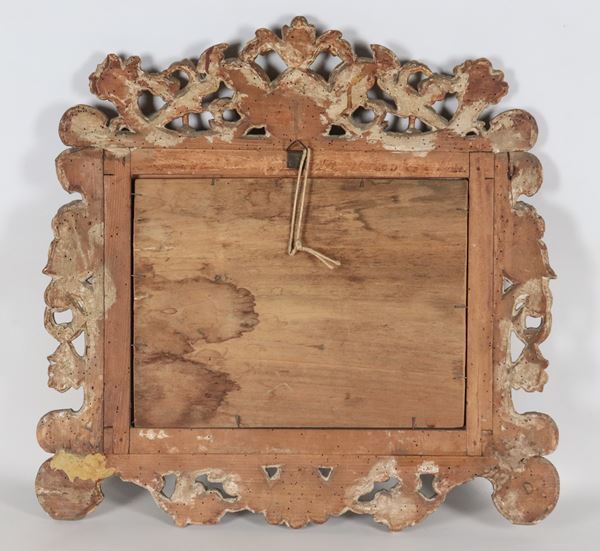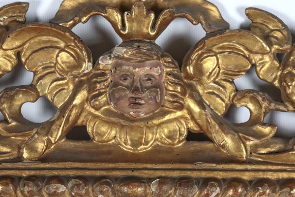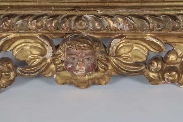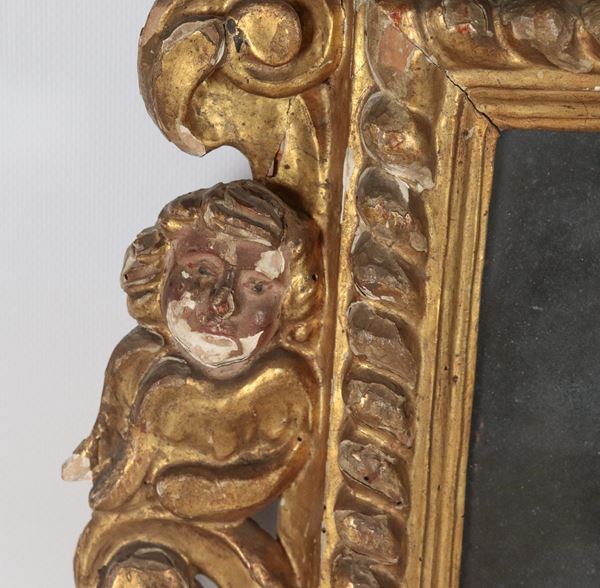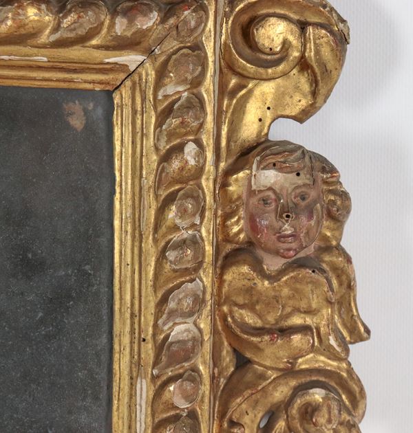 Small Tuscan Louis XIV mirror in gilded wood, carved with motifs of cherubs, eagles, cornucopias and acanthus leaf scrolls.