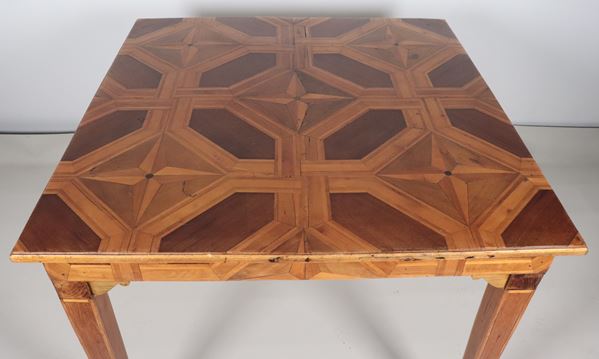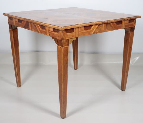 Square walnut center table, inlaid with various precious woods and geometric patterns