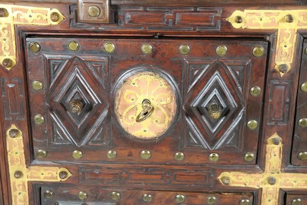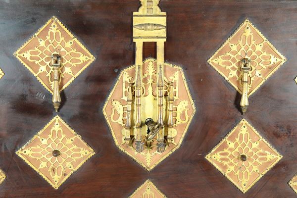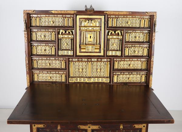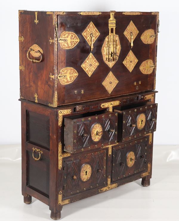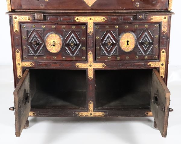 Two-piece walnut bargueno, with geometric motif carvings and gilded and chiseled bronze applications