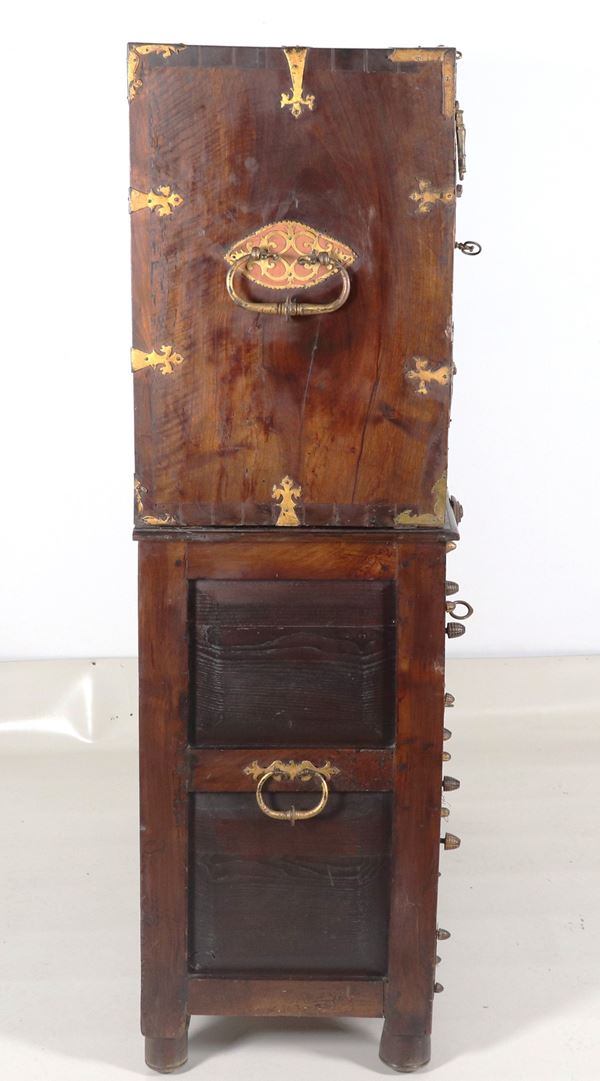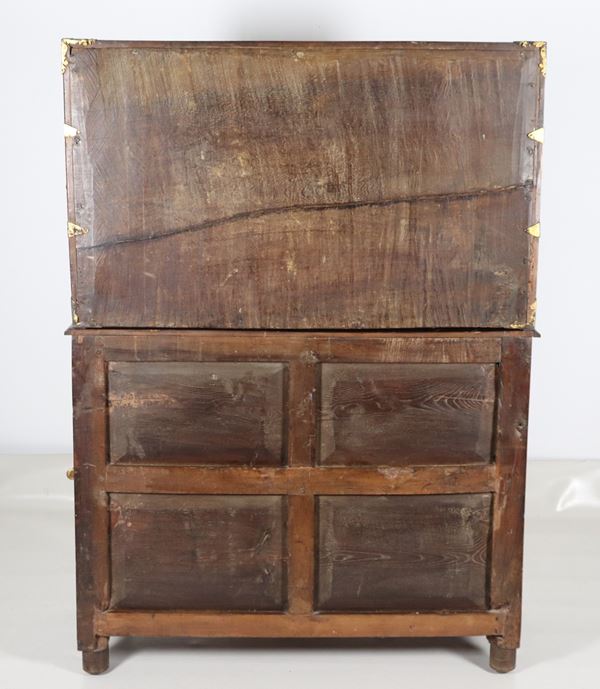 The upper part has a hinged door and a series of inlaid and gilded drawers inside, resting on a body with two drawers and two doors underneath. On the sides of both bodies are gilded iron handles and iron locks. 108 x 46 x 148 cm (42 x 18 x 58 in)