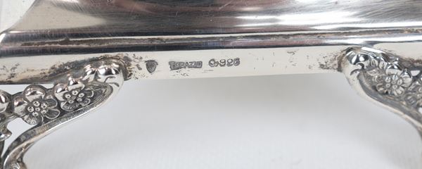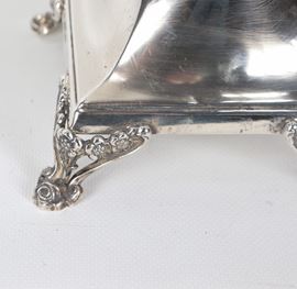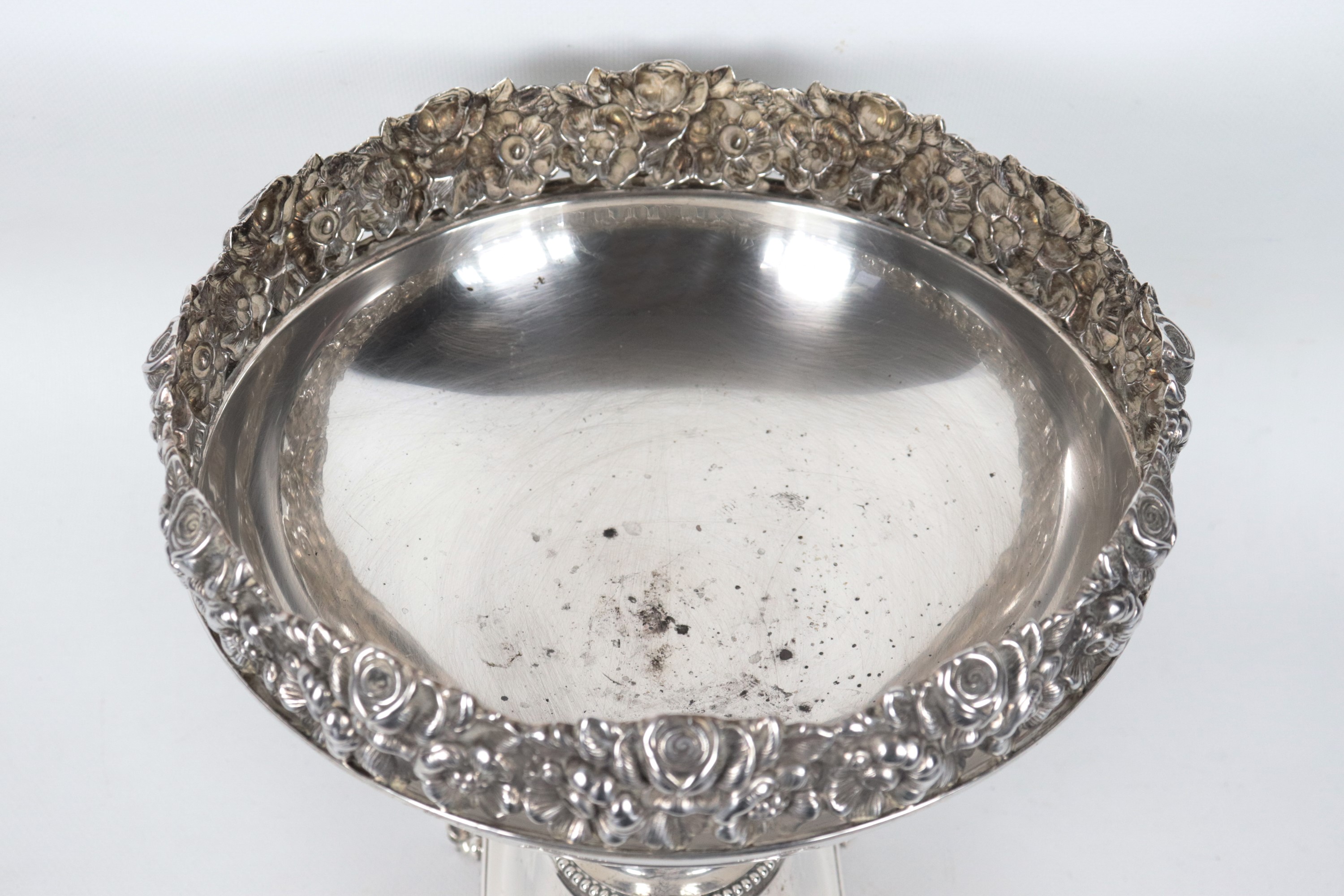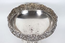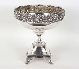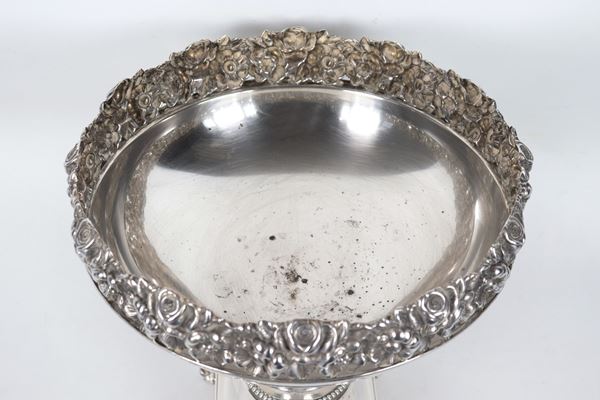 925 silver cup-shaped stand, with embossed and chiseled edge featuring floral garland motifs, supported by four lion feet, 1185g