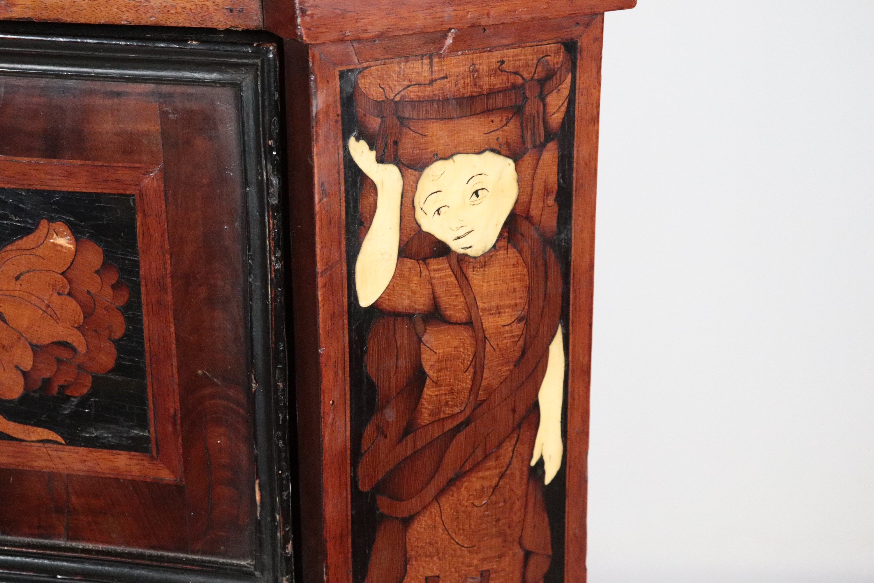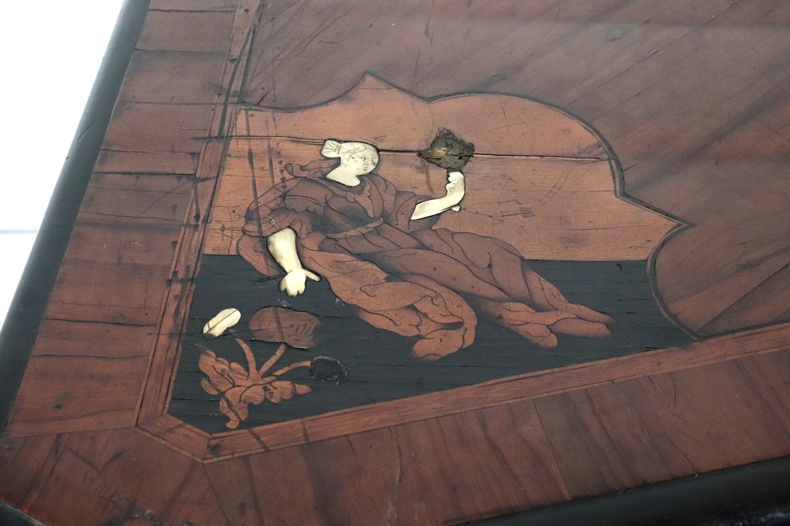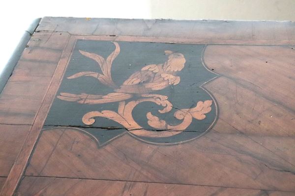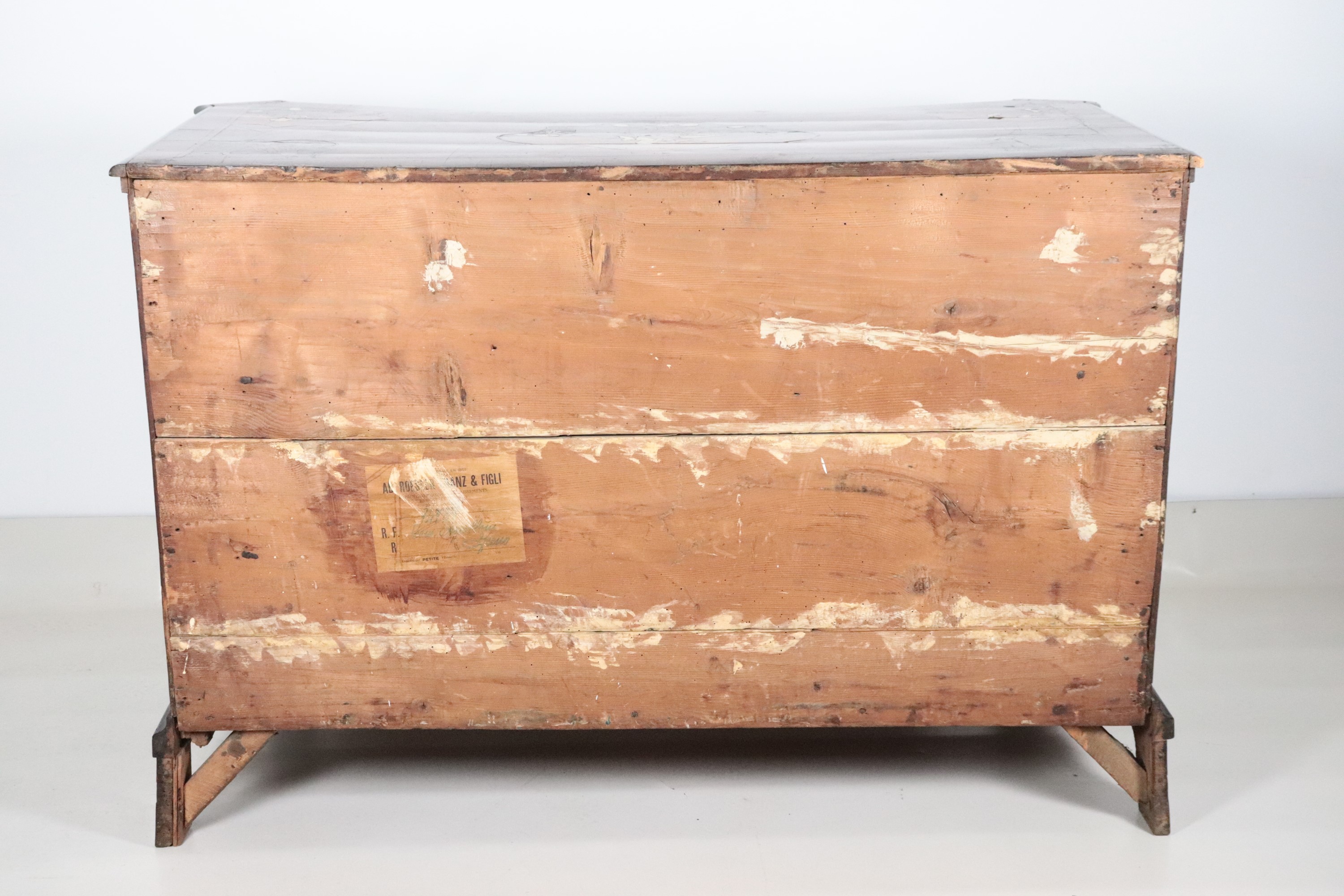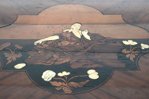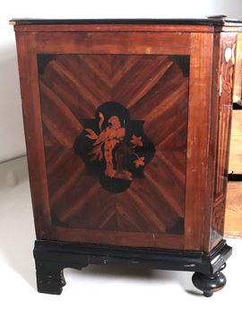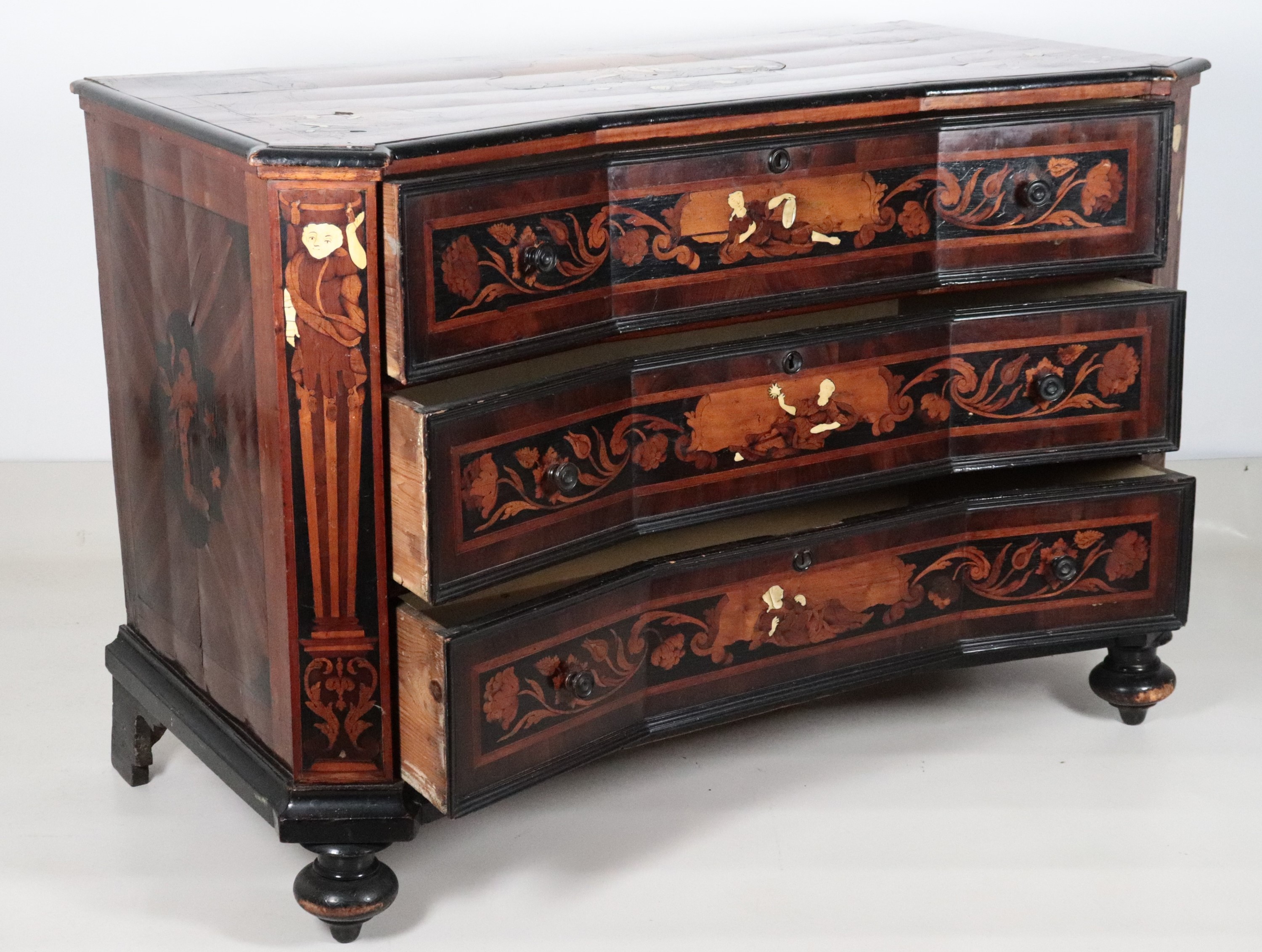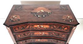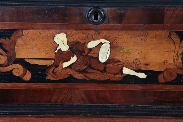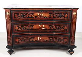 A Lombard-Venetian chest of drawers from the Louis XV era, with a curved shape, made of walnut and various fine woods, inlaid with floral scrolls, [..]