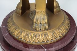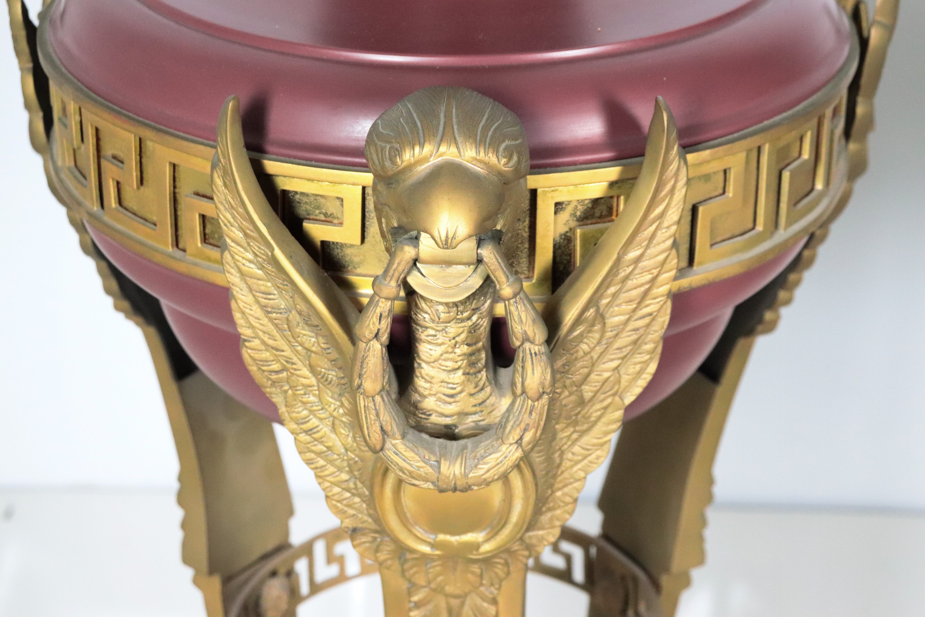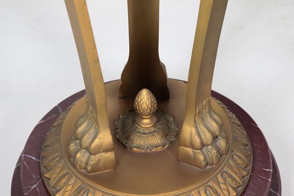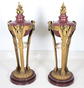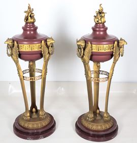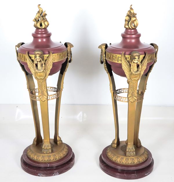 A pair of large antique French tripods in gilded bronze, embossed, chiseled, and lacquered in purple, with legs featuring griffin sculptures. [..]