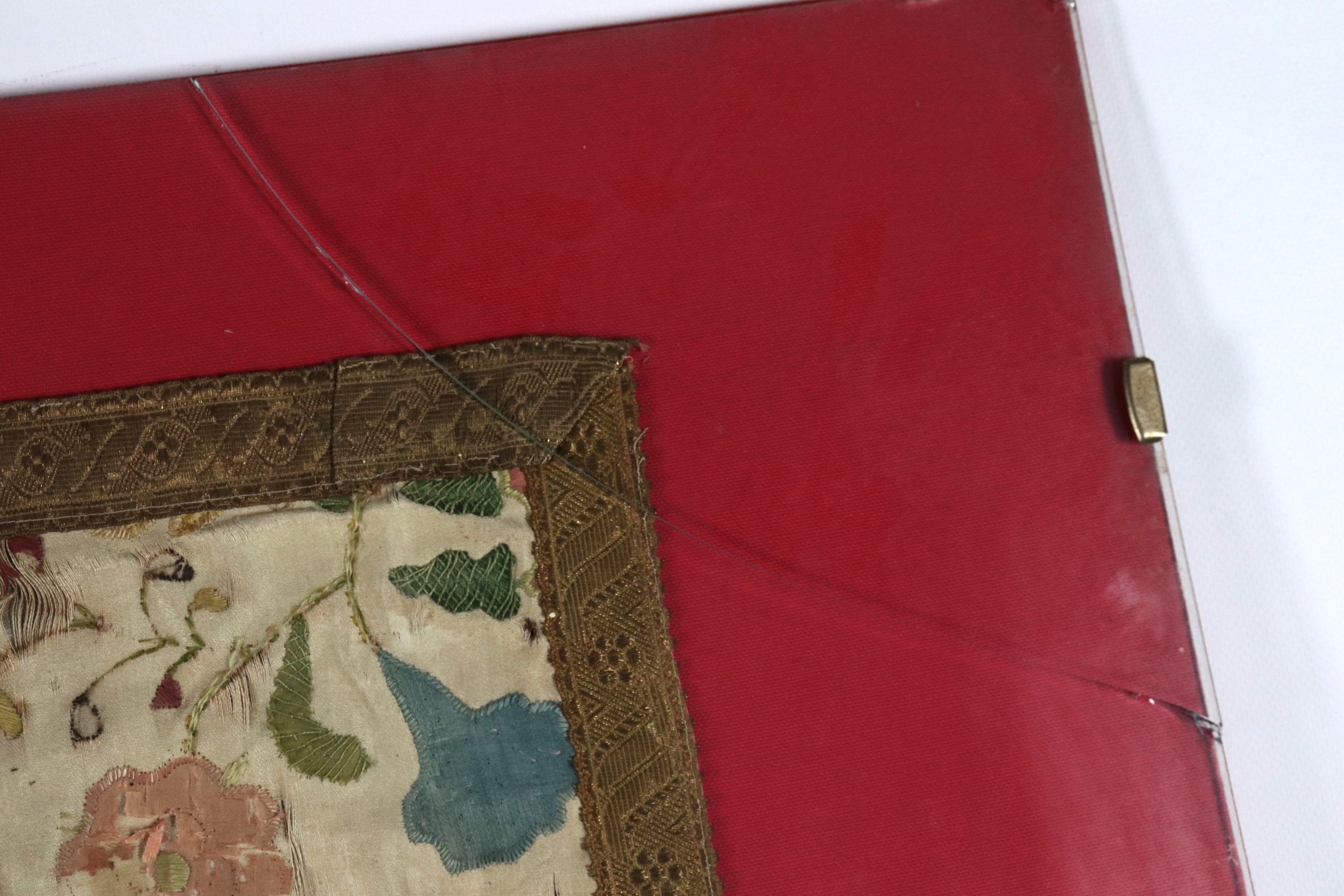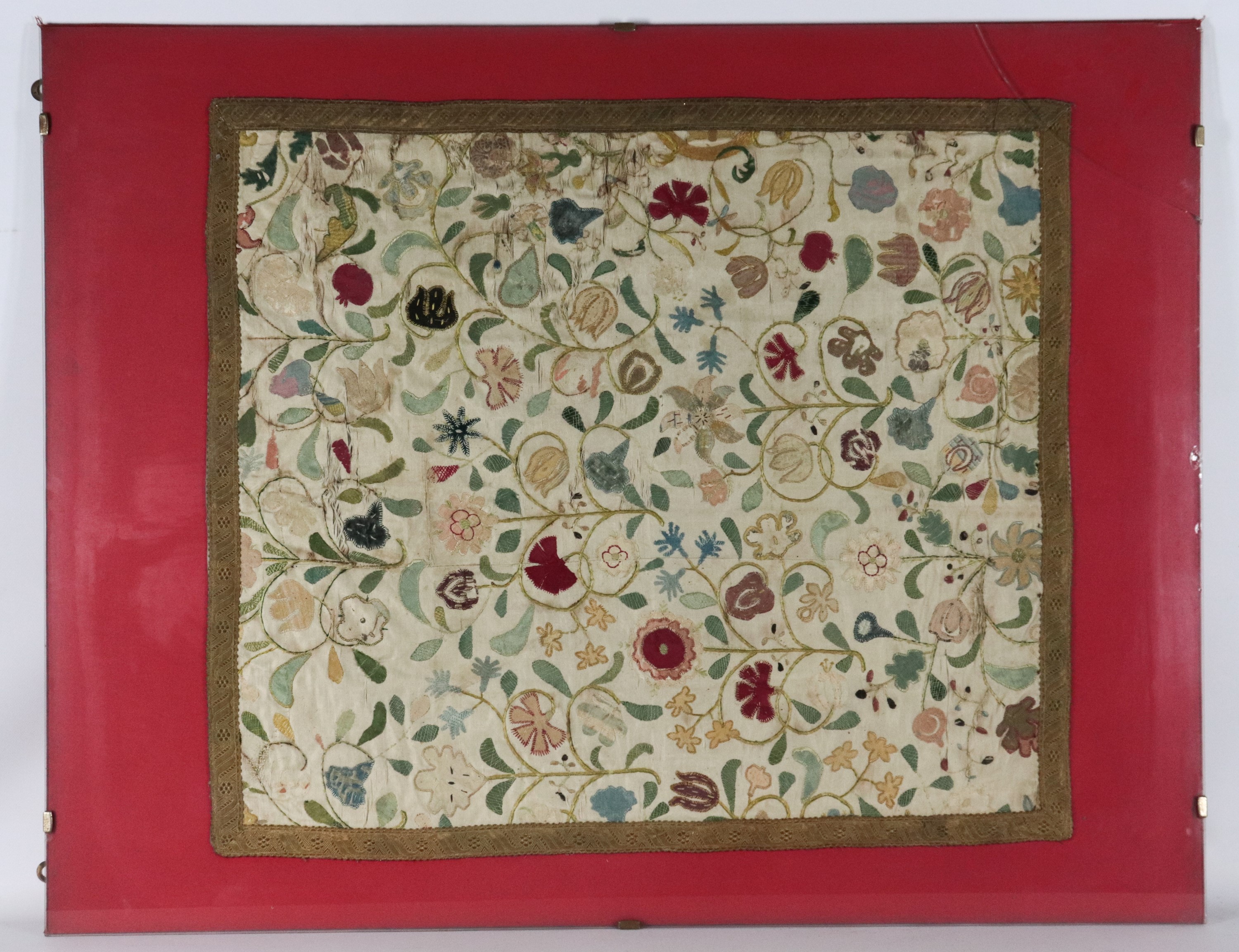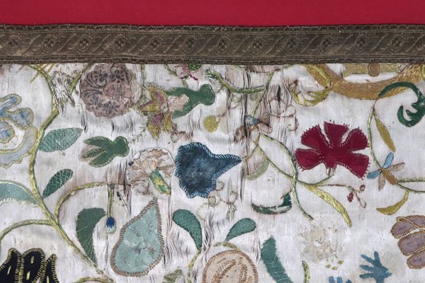 Ancient embroidered fabric drape with polychrome floral allegory motifs