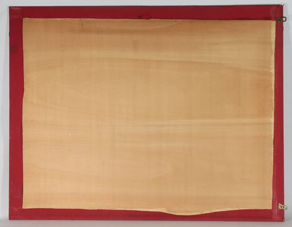 Mounted on a wooden panel with glass. The glass has a break in one corner, 91 x 80 cm.