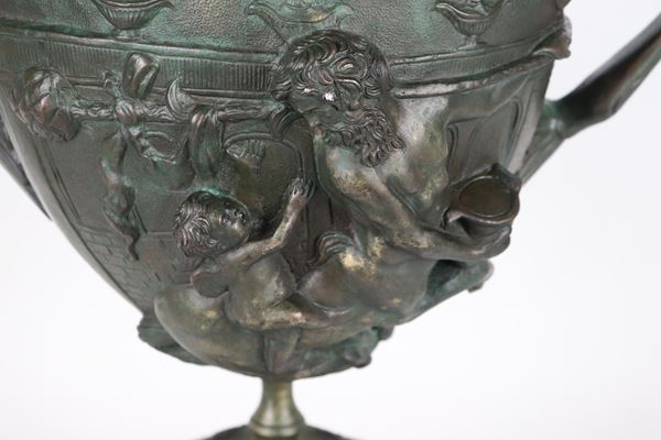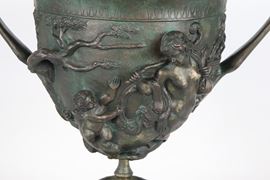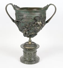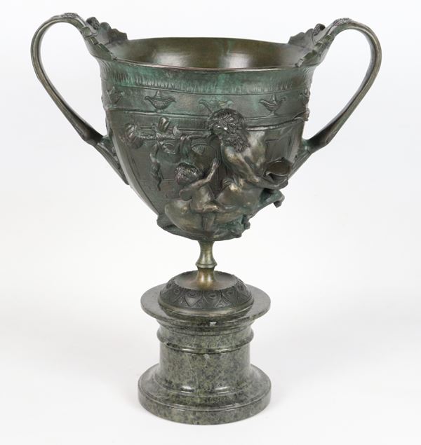 Ancient large bronze cup decorated with mythological motifs, supported by a green Alpine marble base