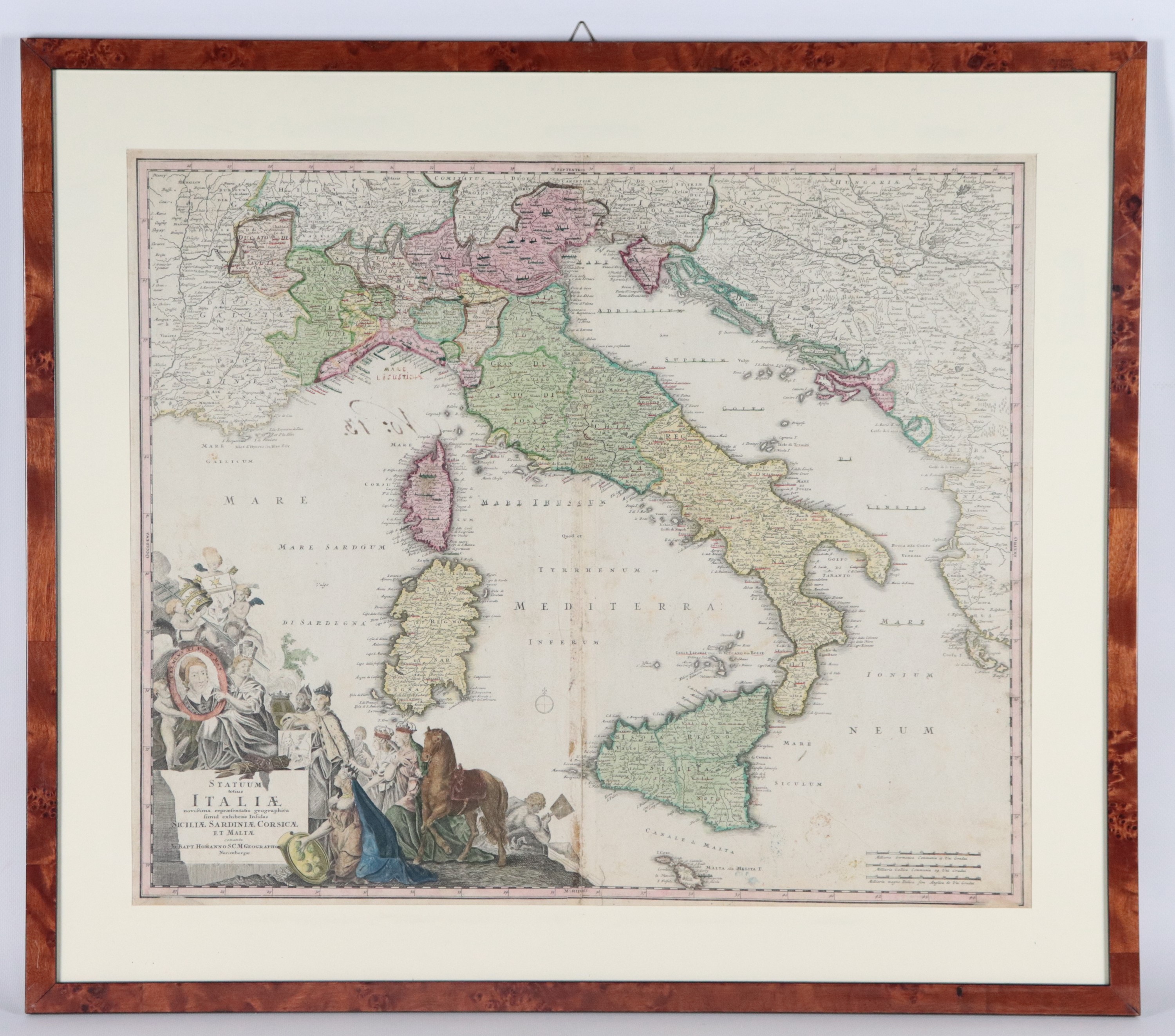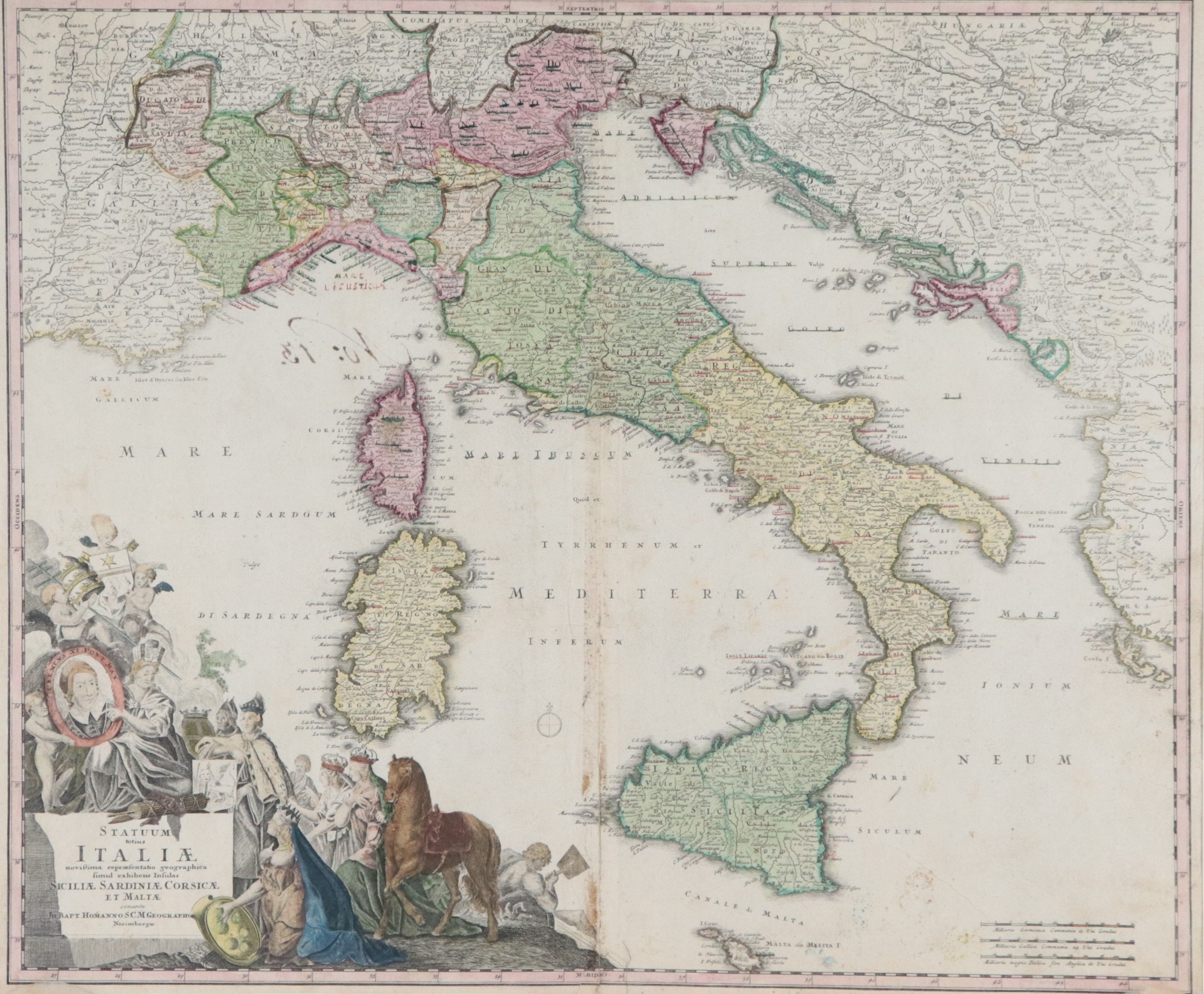 Ancient topographic map of Italy with the islands of Sicily, Sardinia, Corsica and Malta