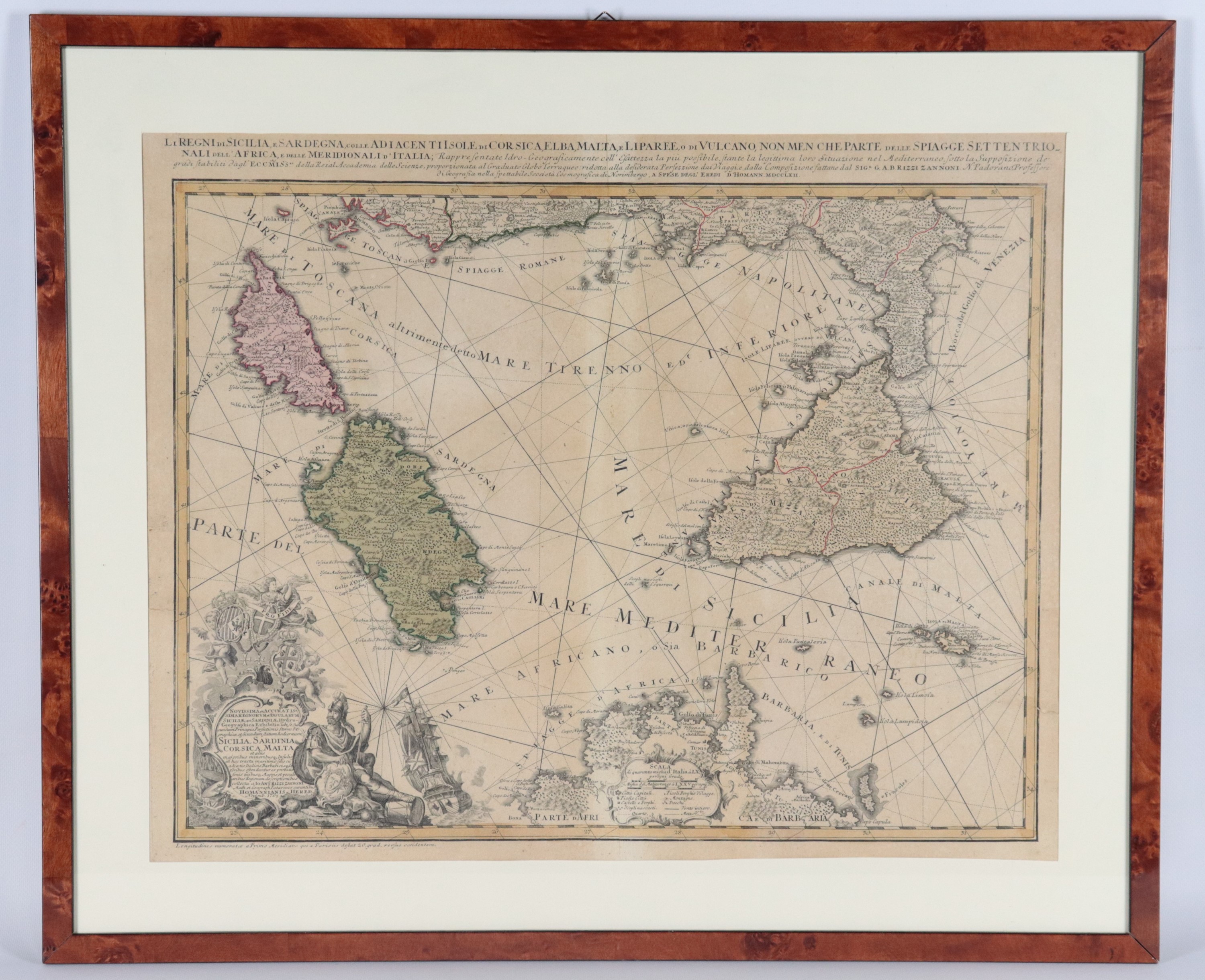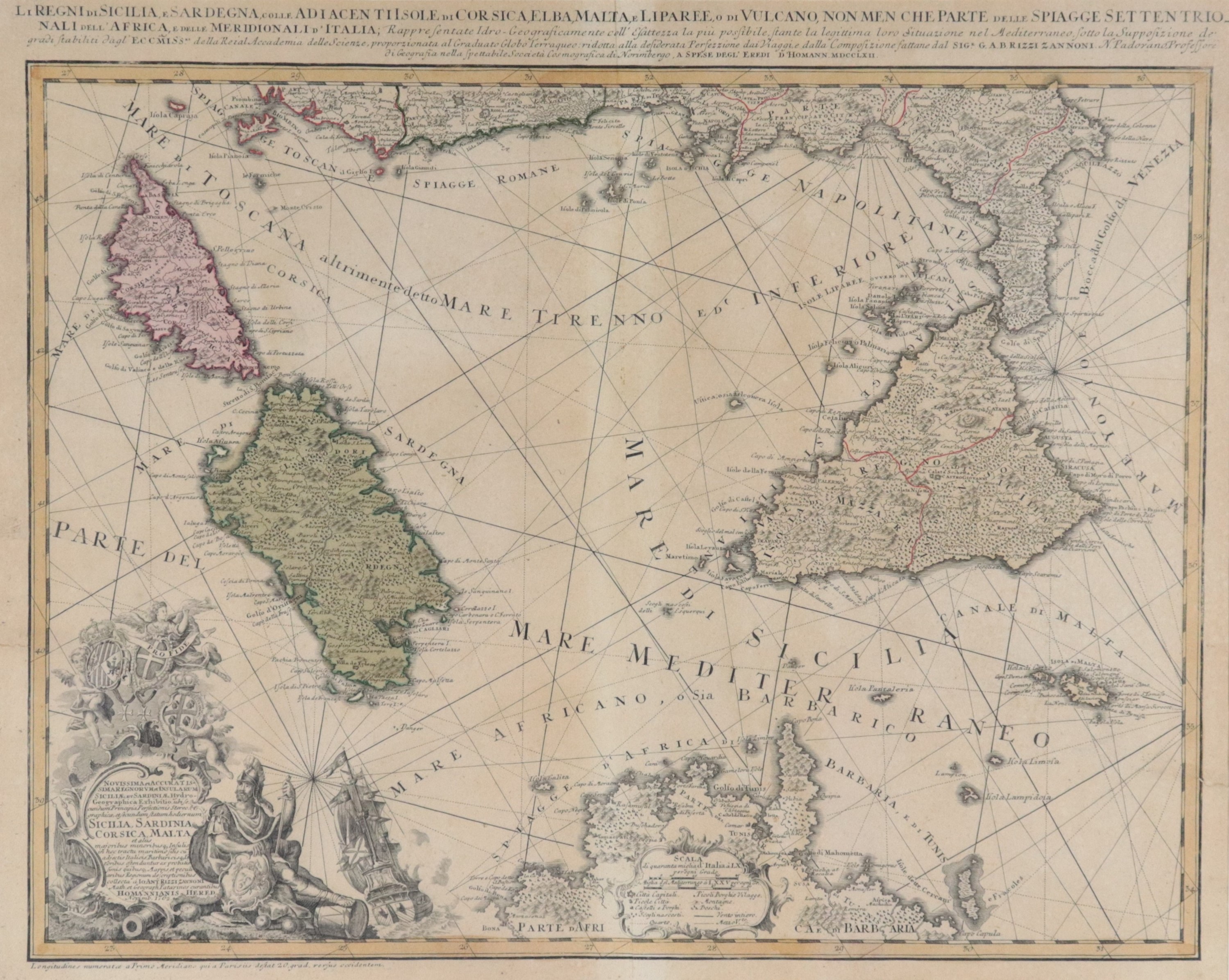 Ancient topographic map of Sicily and Sardinia, with Corsica, Elba, Malta, the Lipari Islands and parts of the Italian and African coasts