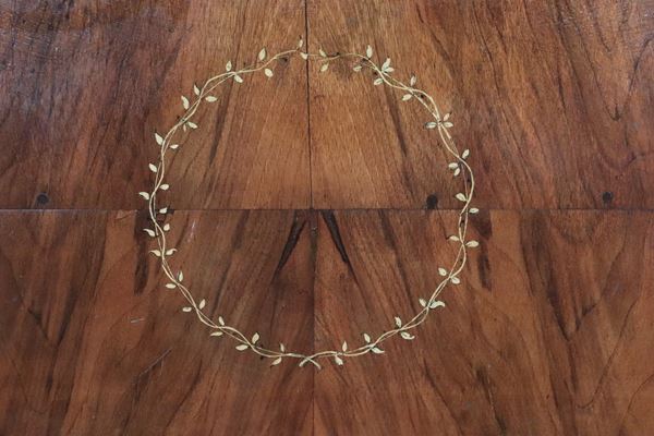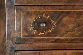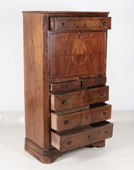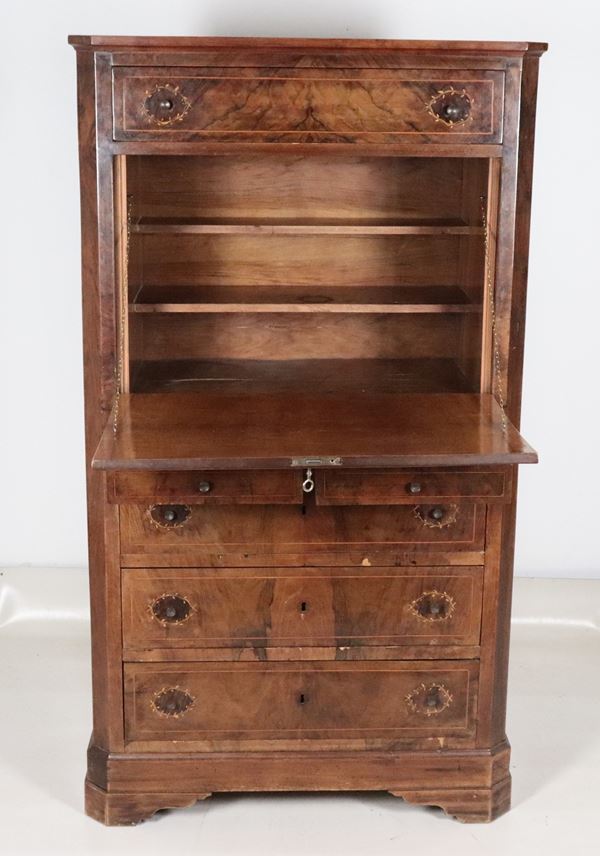 Antique Charles X secretaire in walnut and walnut root, with geometric and floral boxwood inlays