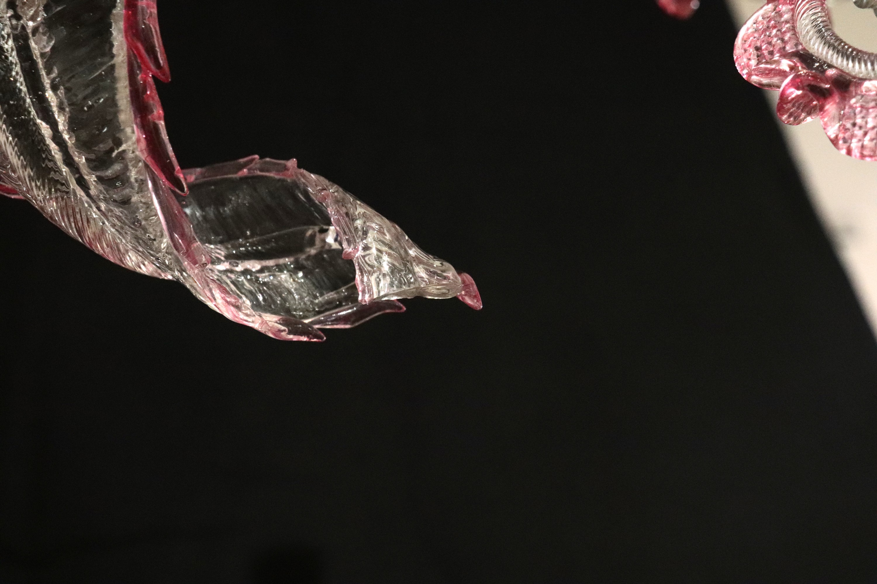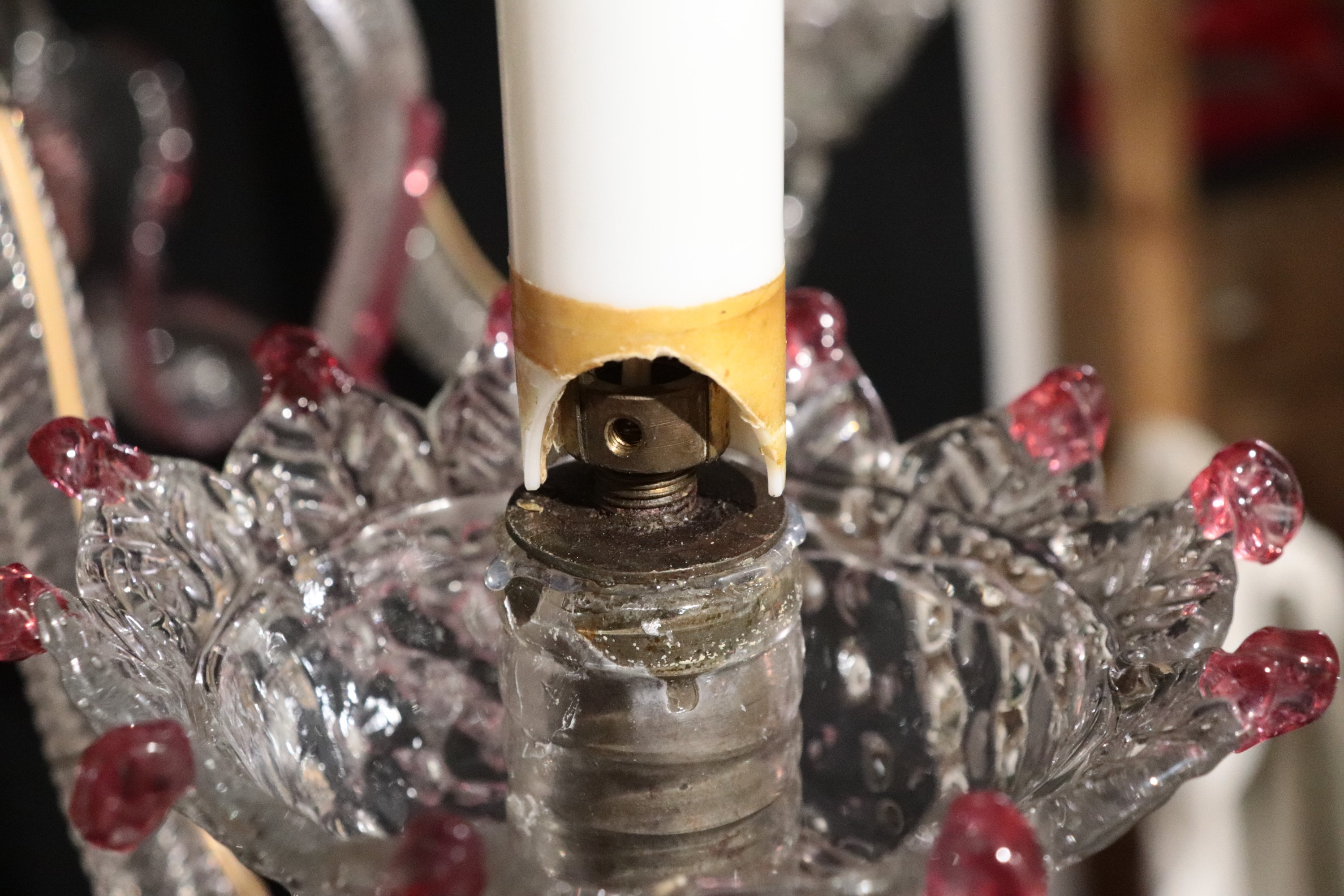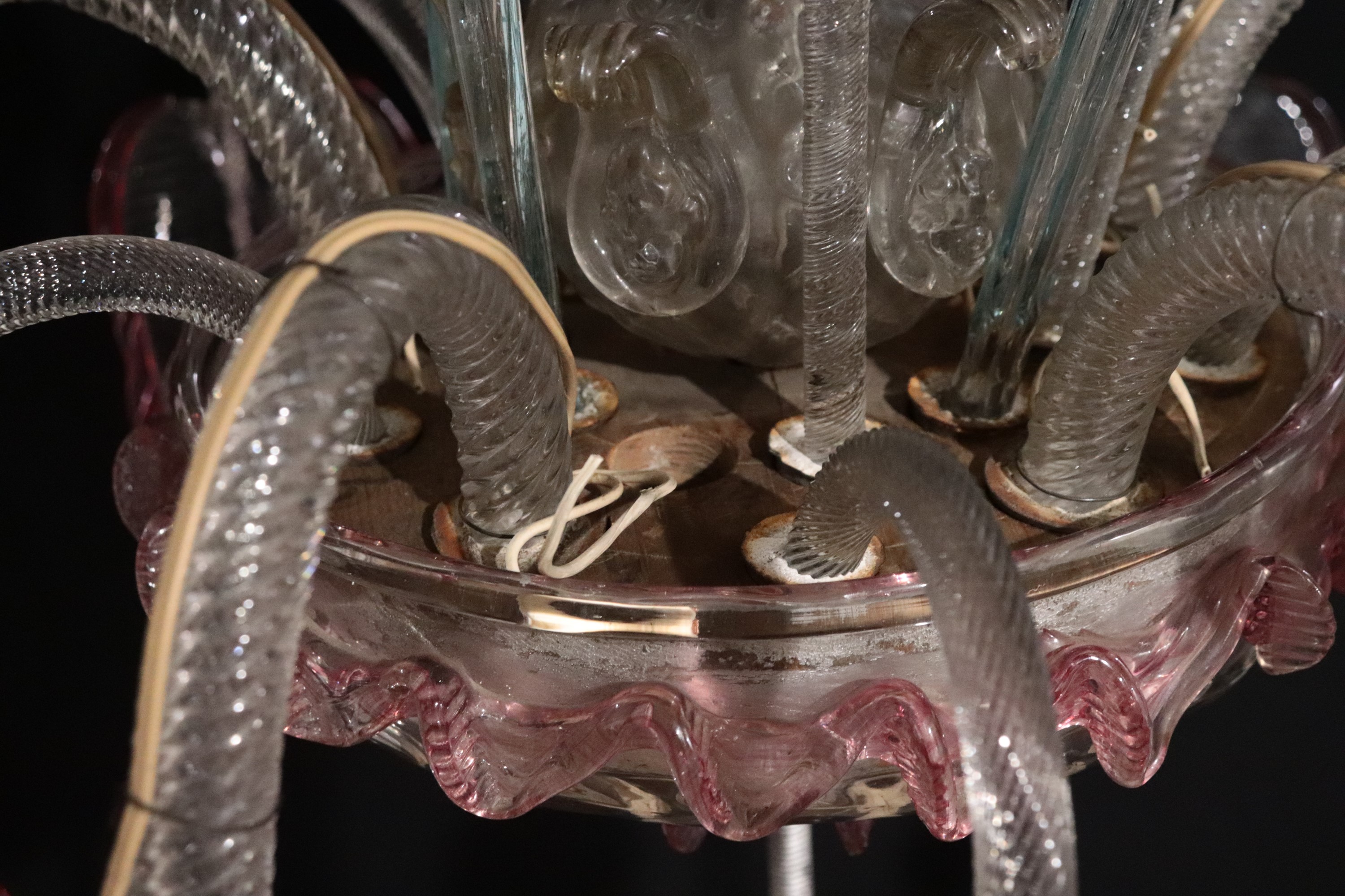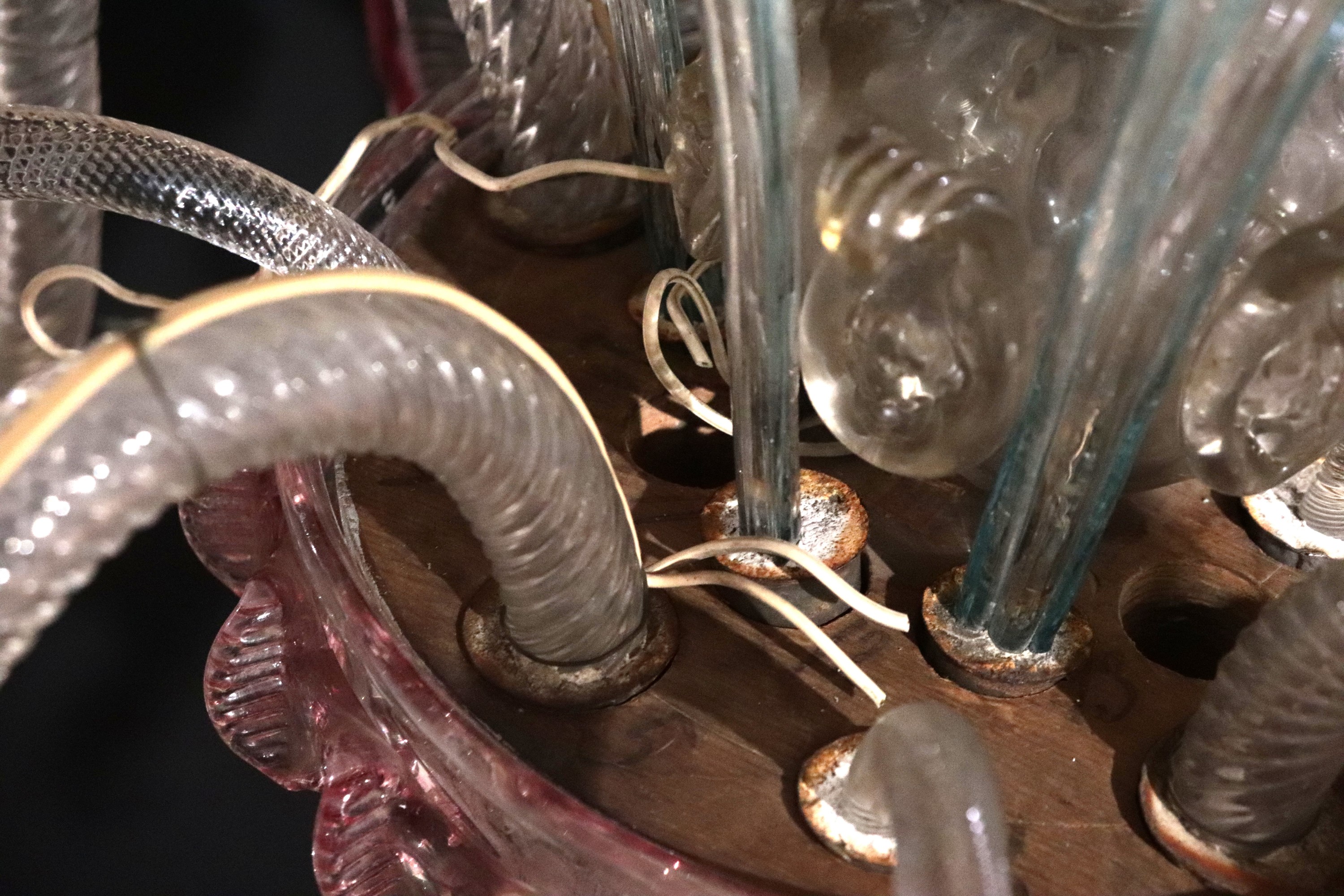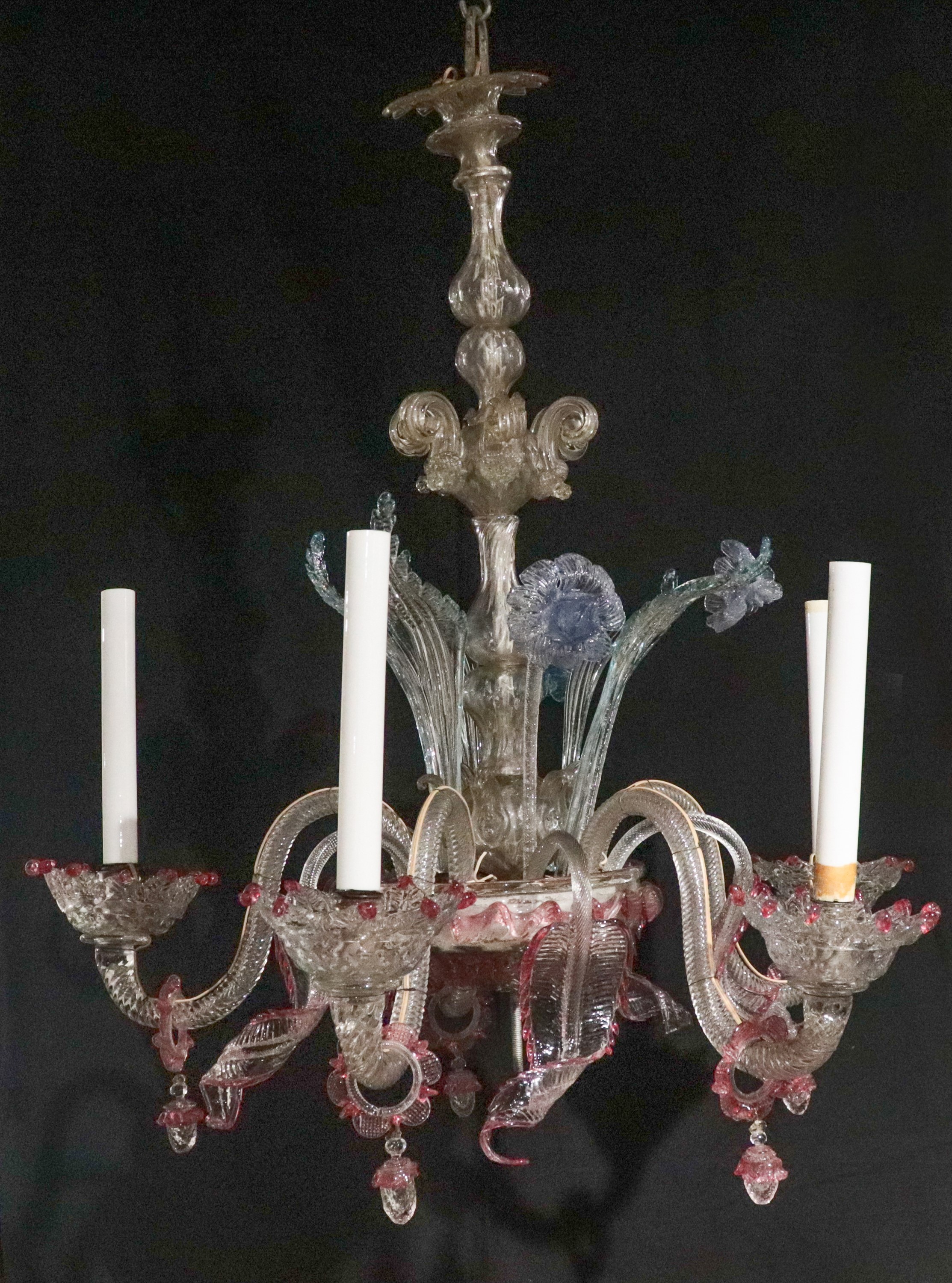 Antique clear Murano glass chandelier with coloured edges and flowers, 5 lights