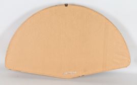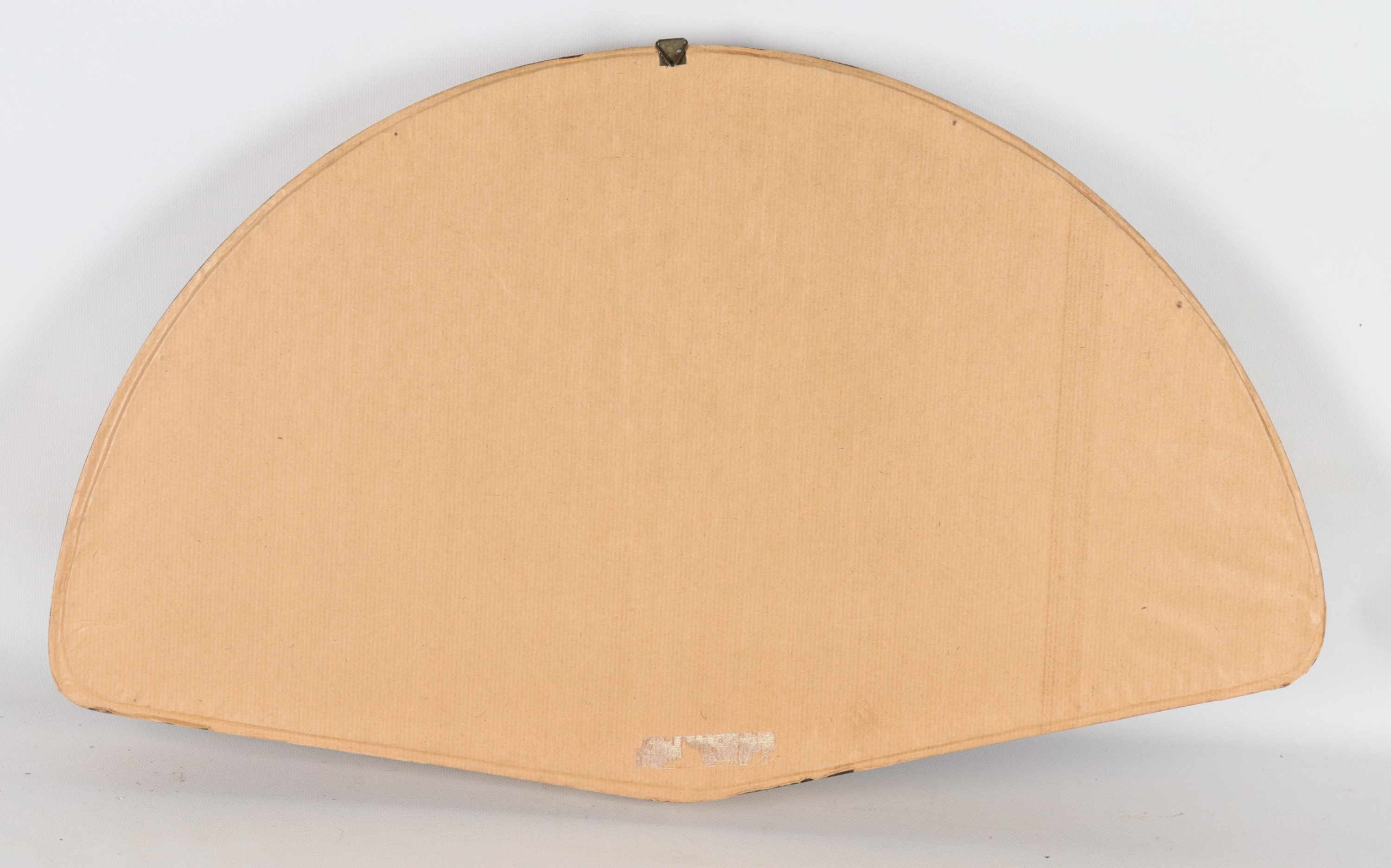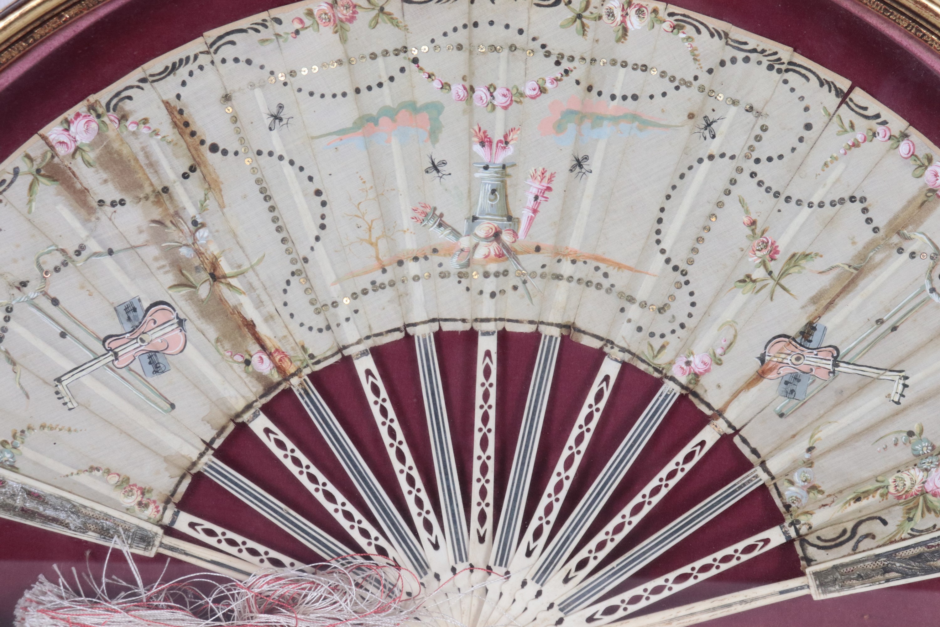 Antique fan decorated and colorful with allegorical scenes, musical instruments and tower with torches, in a gilded wooden showcase frame