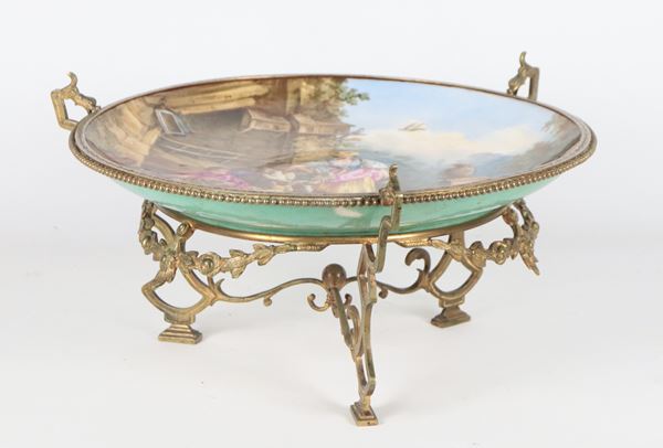 Antique French gilded bronze stand, embossed and chiseled, with central plate in polychrome porcelain with peasant scene