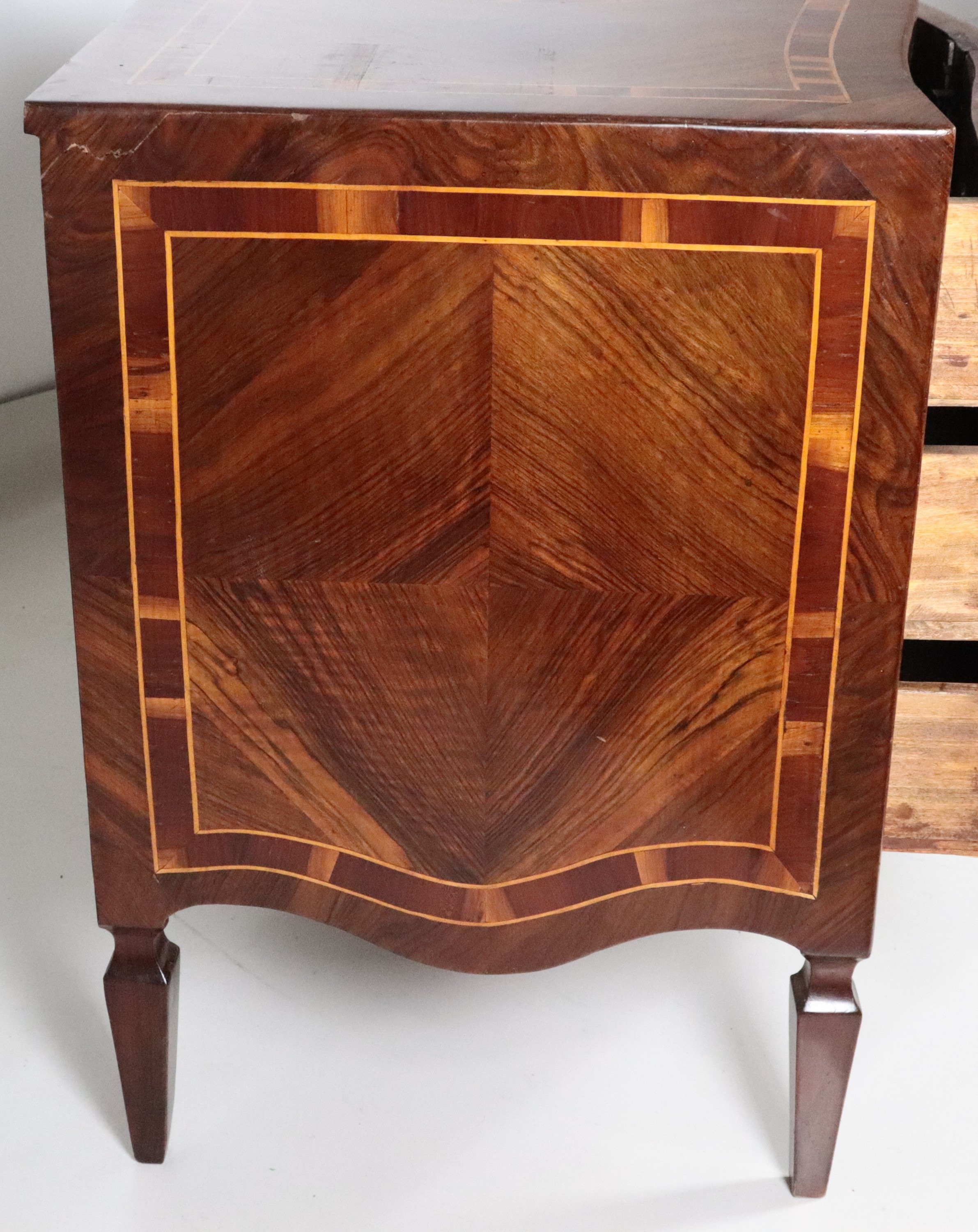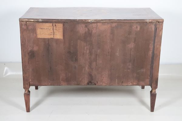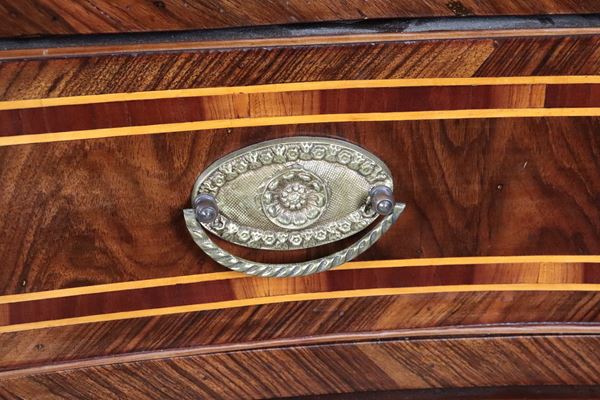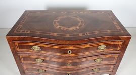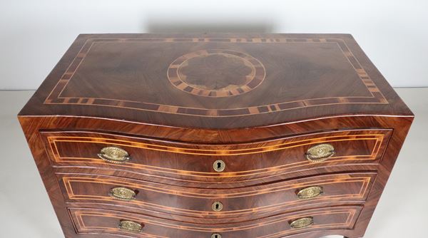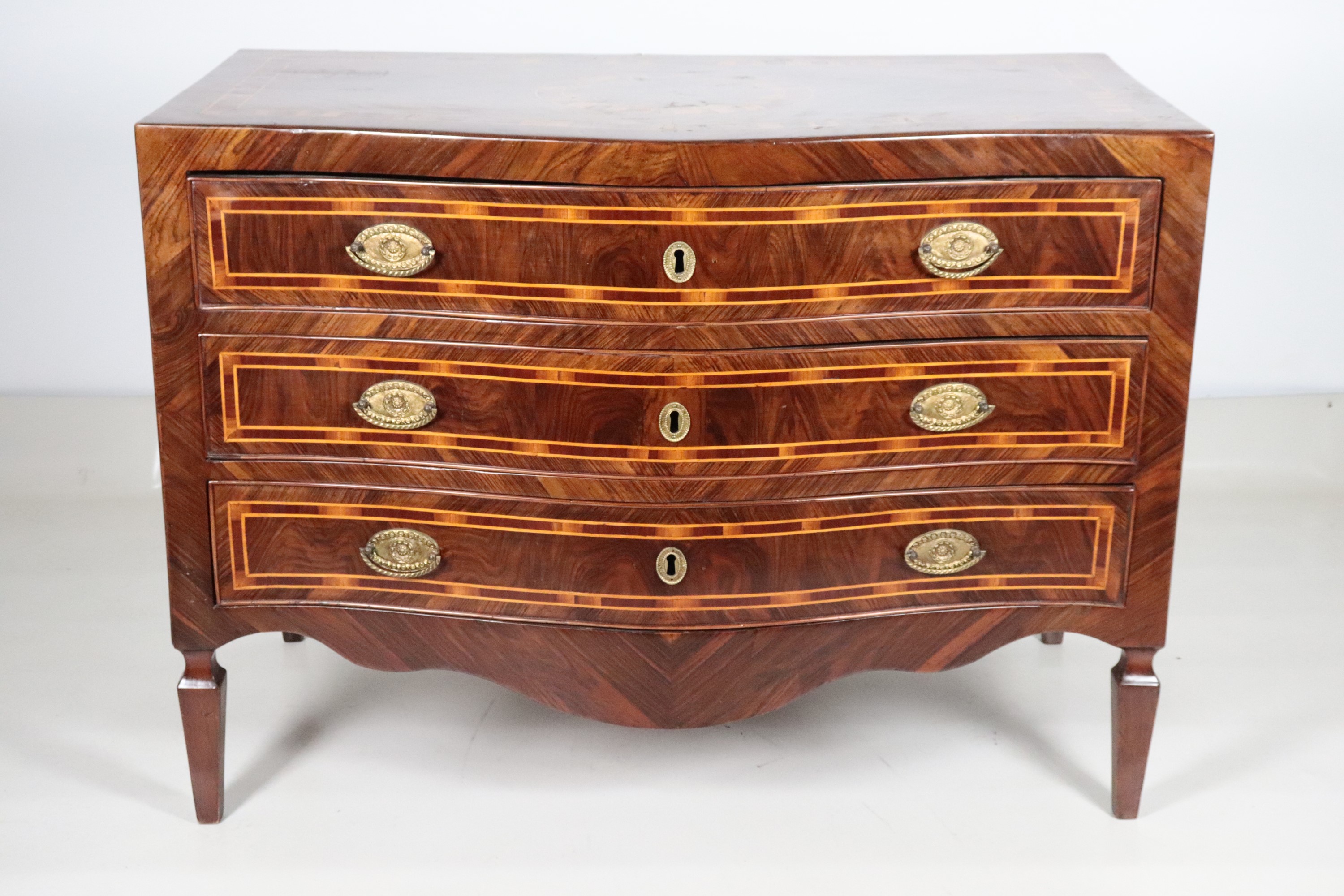 Antique Neapolitan chest of drawers in walnut, rounded shape with inlaid boxwood threads and a rosette on the purple ebony top