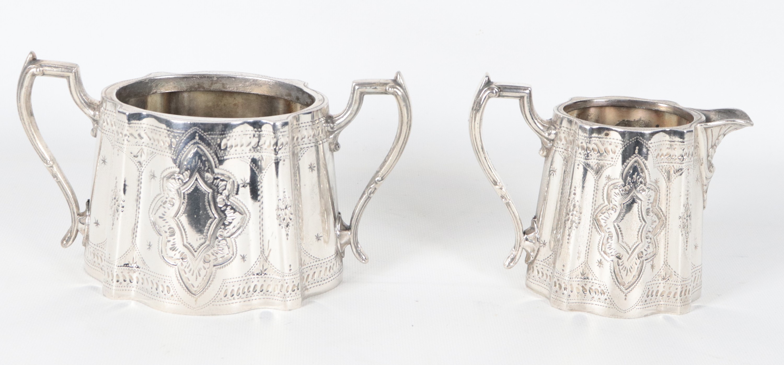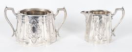 Antique Sheffield engraved and embossed lot of a sugar bowl and a milk jug (2 pcs.)