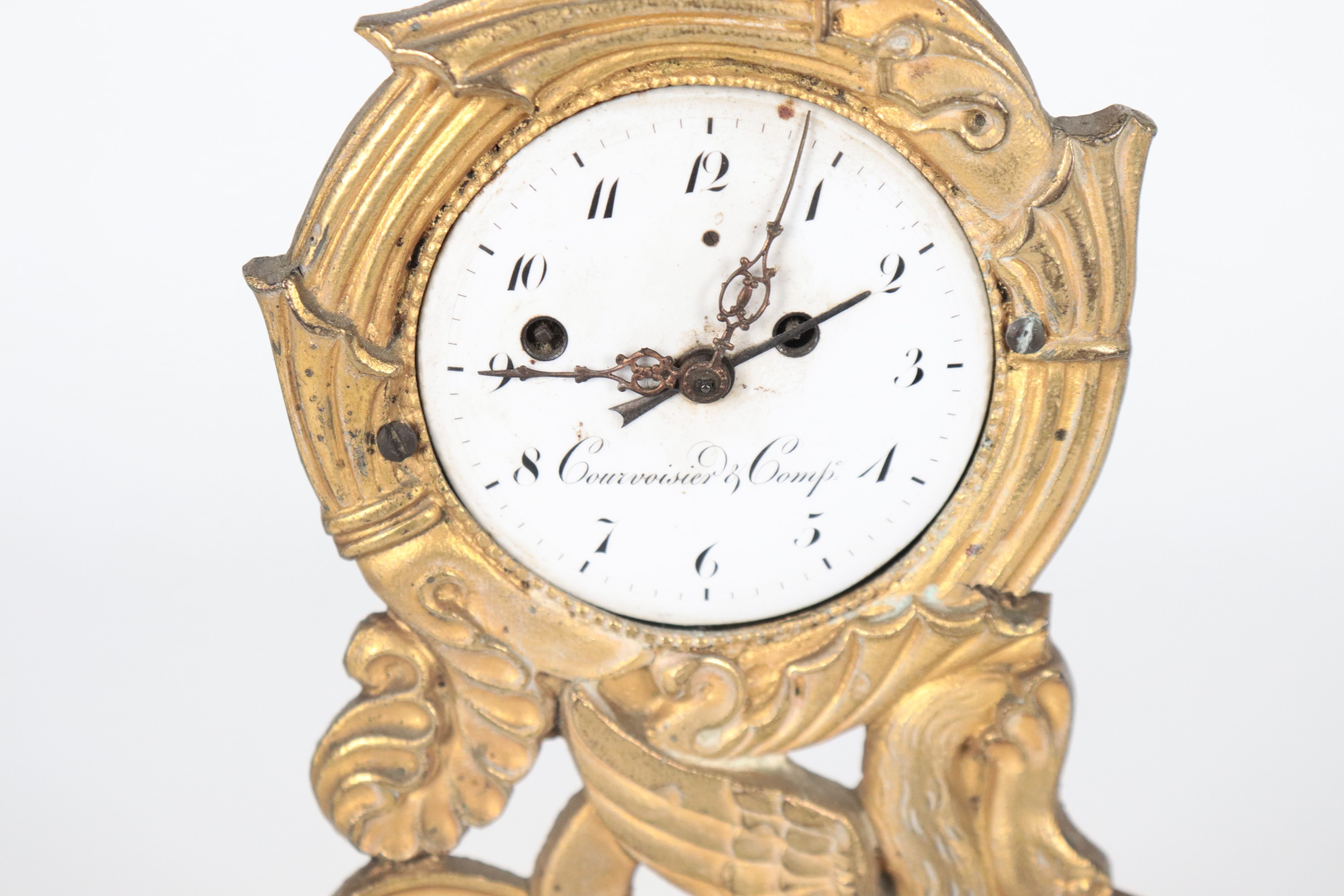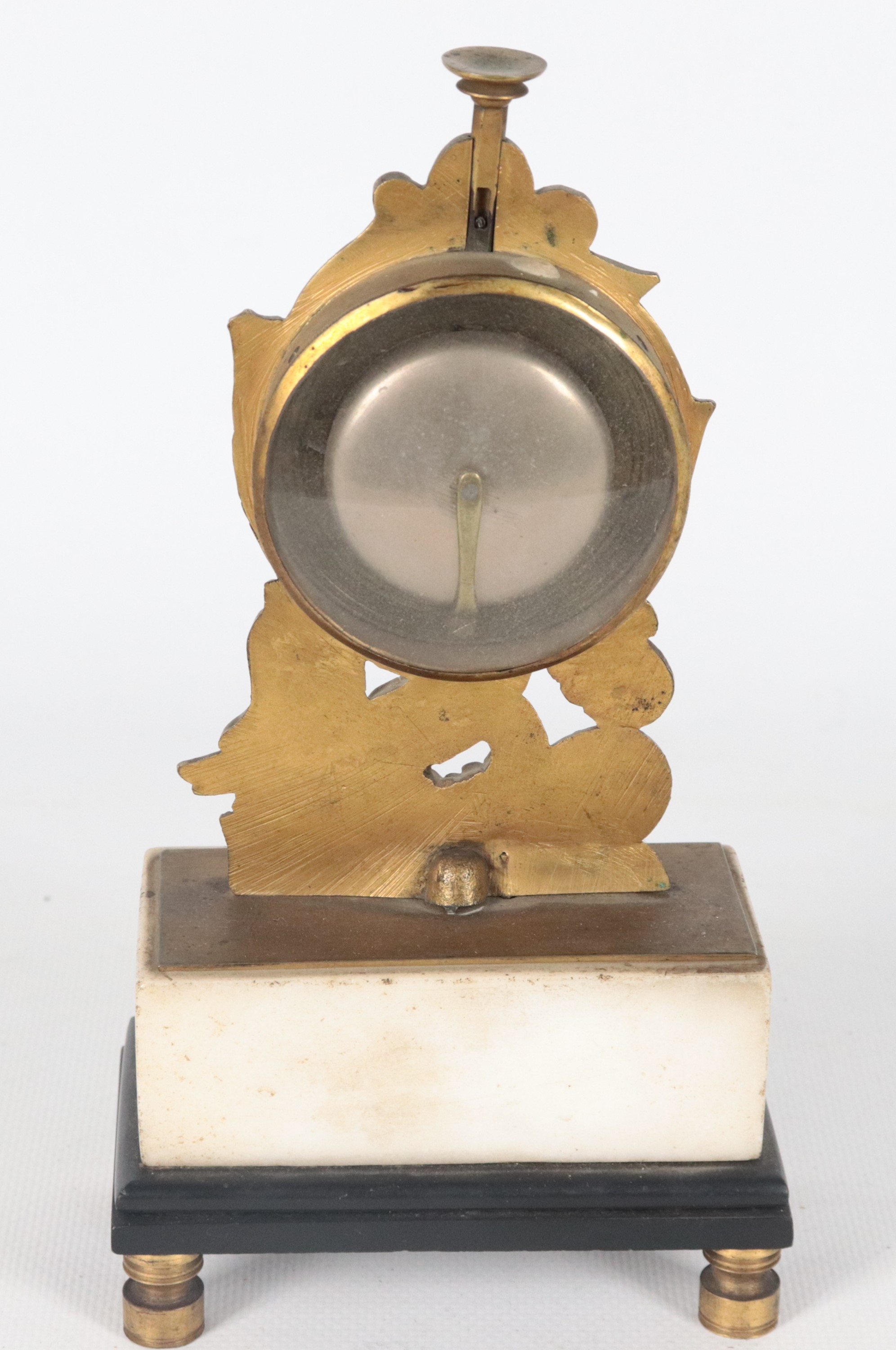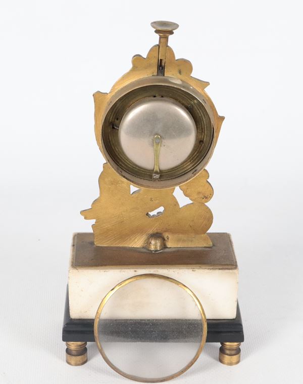 Antique small French Empire period table clock, in gilded bronze, embossed and chiseled, white enamel dial and marble base