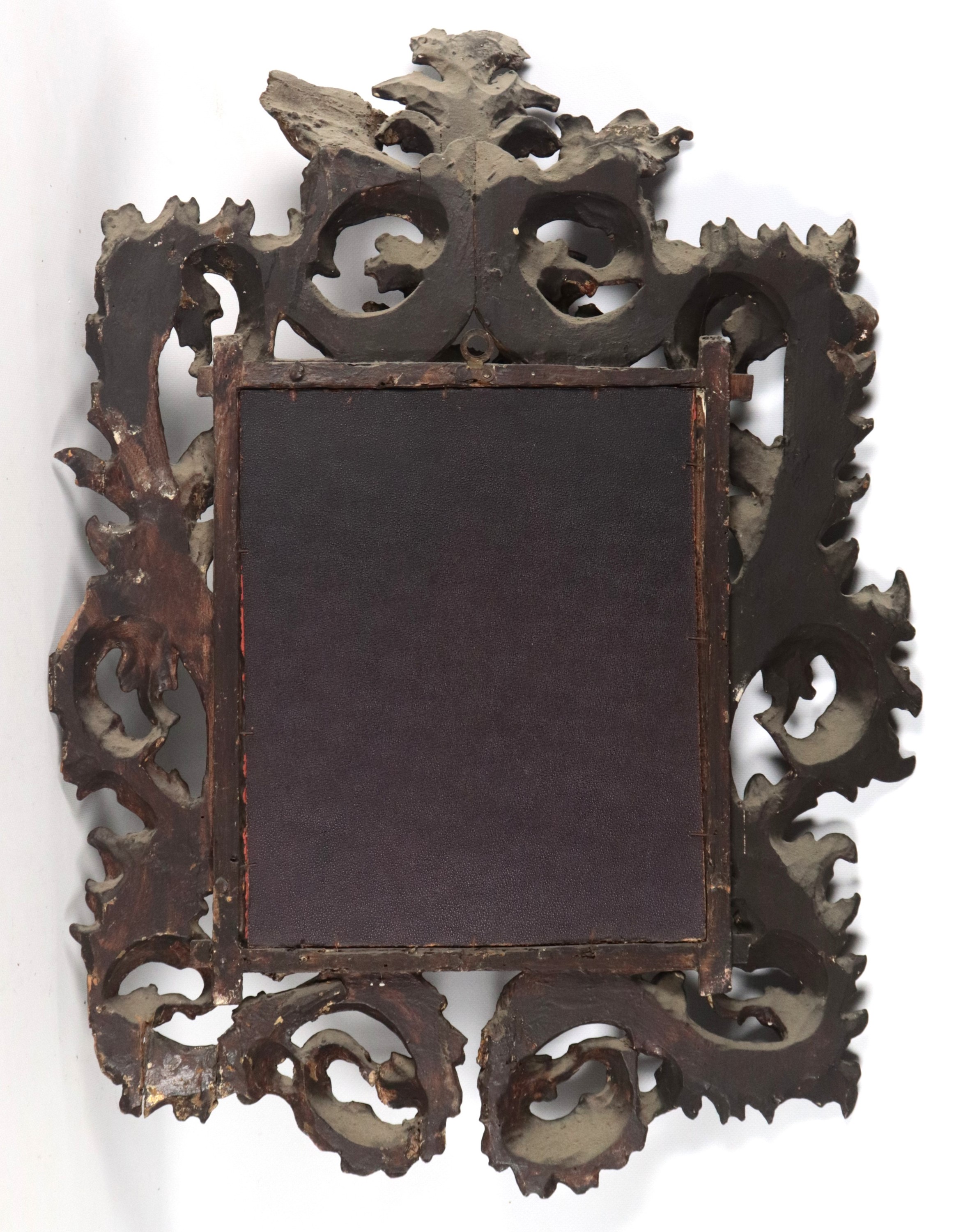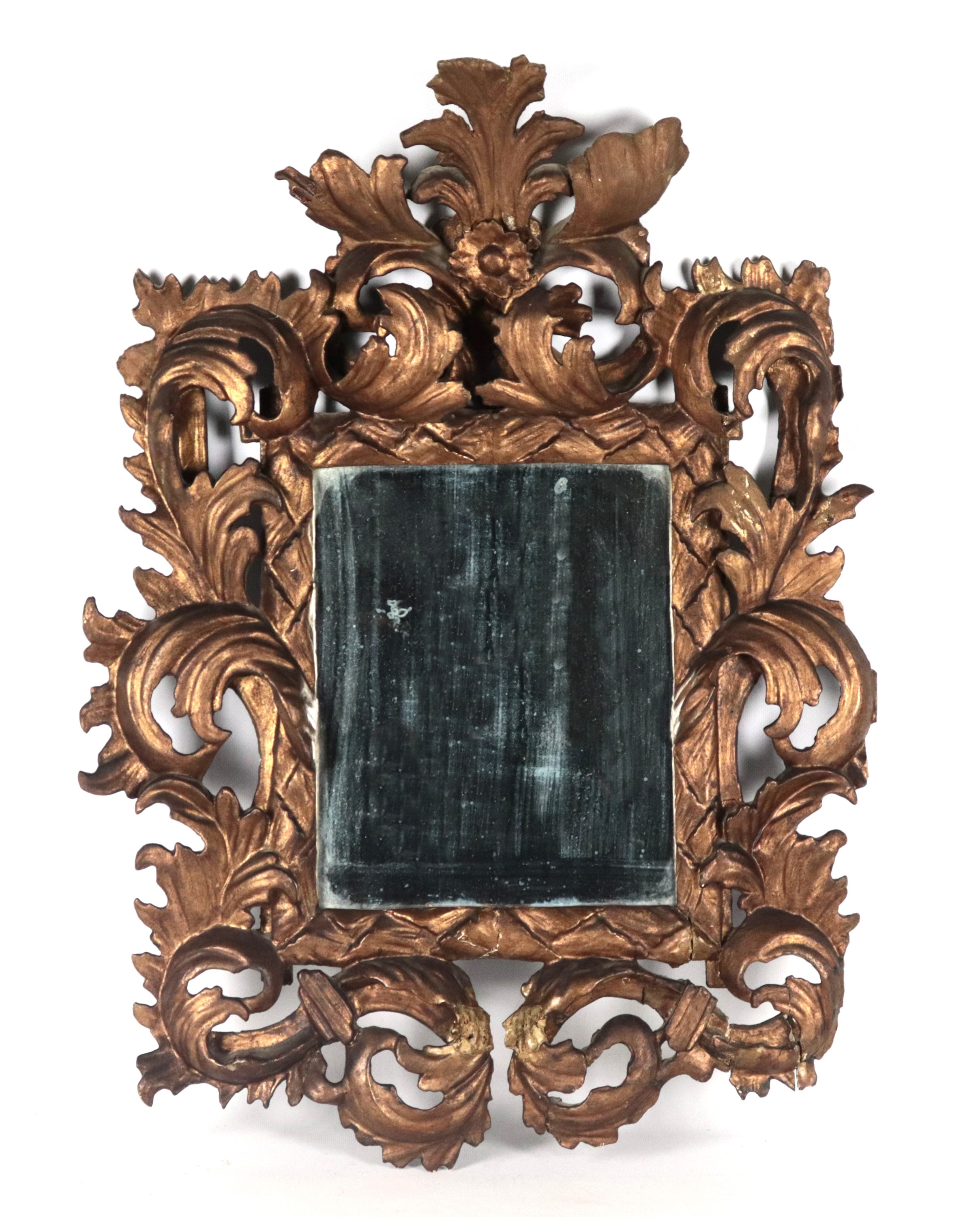 Antique small mirror in gilded wood and carved with Louis XIV motifs of scrolls and acanthus leaves, mercury mirror