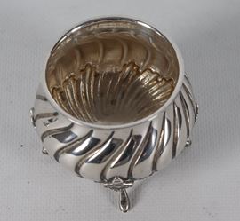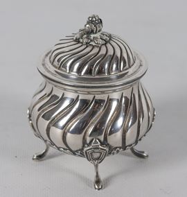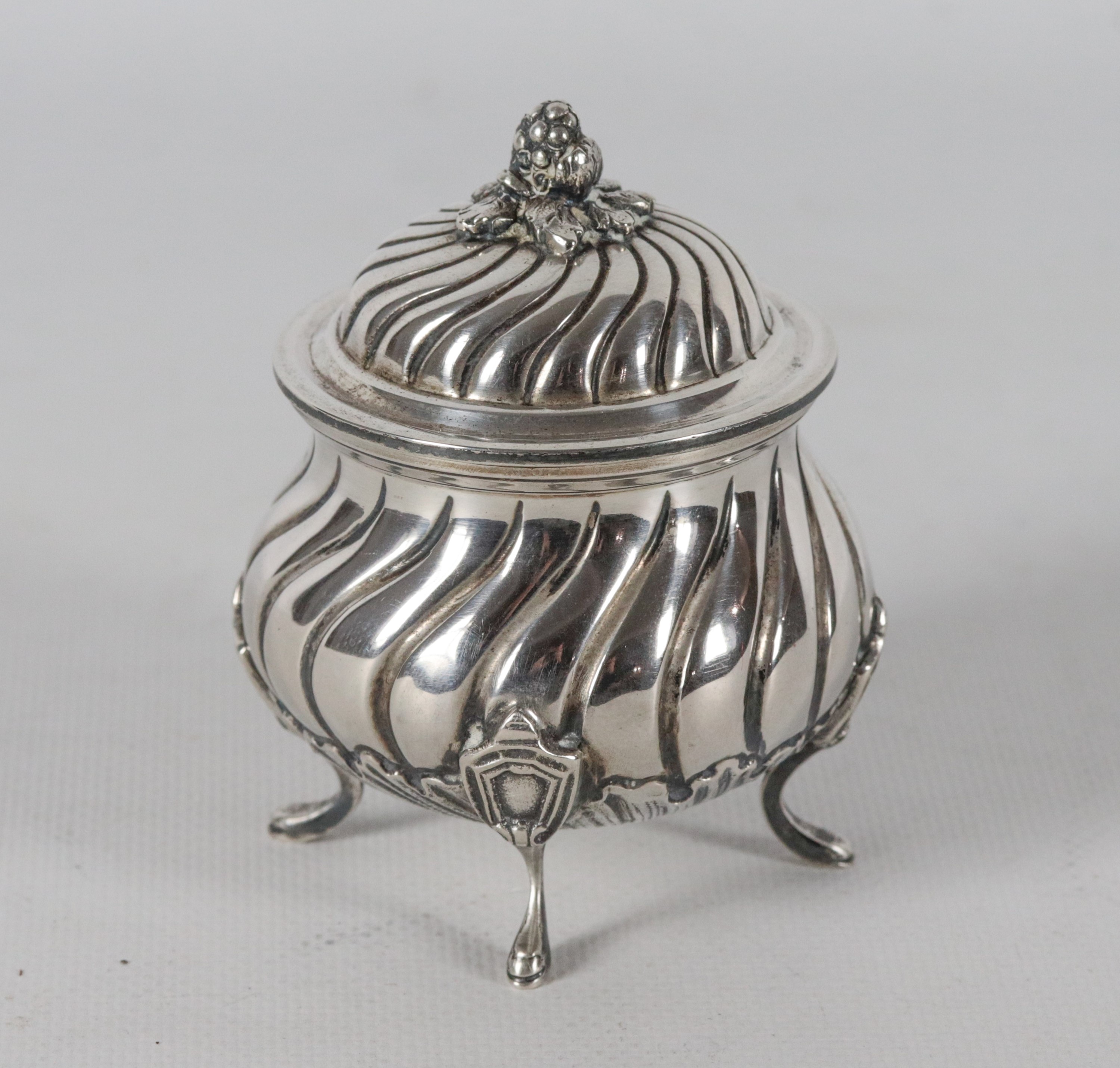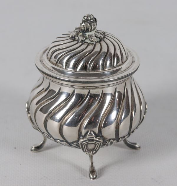 Antique small sugar bowl in torchon-embossed silver, supported by four curved feet, 140 g