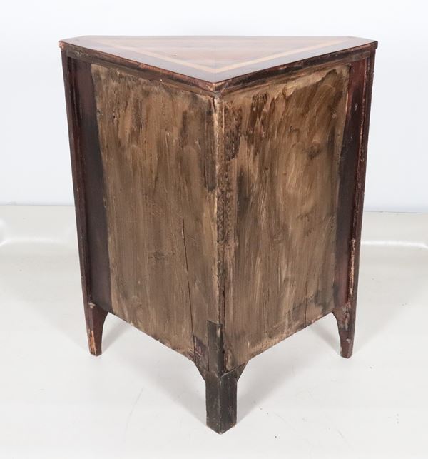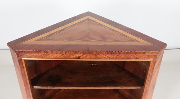 Antique walnut corner cabinet, with open front and top inlaid with geometric motifs in maple and olive wood