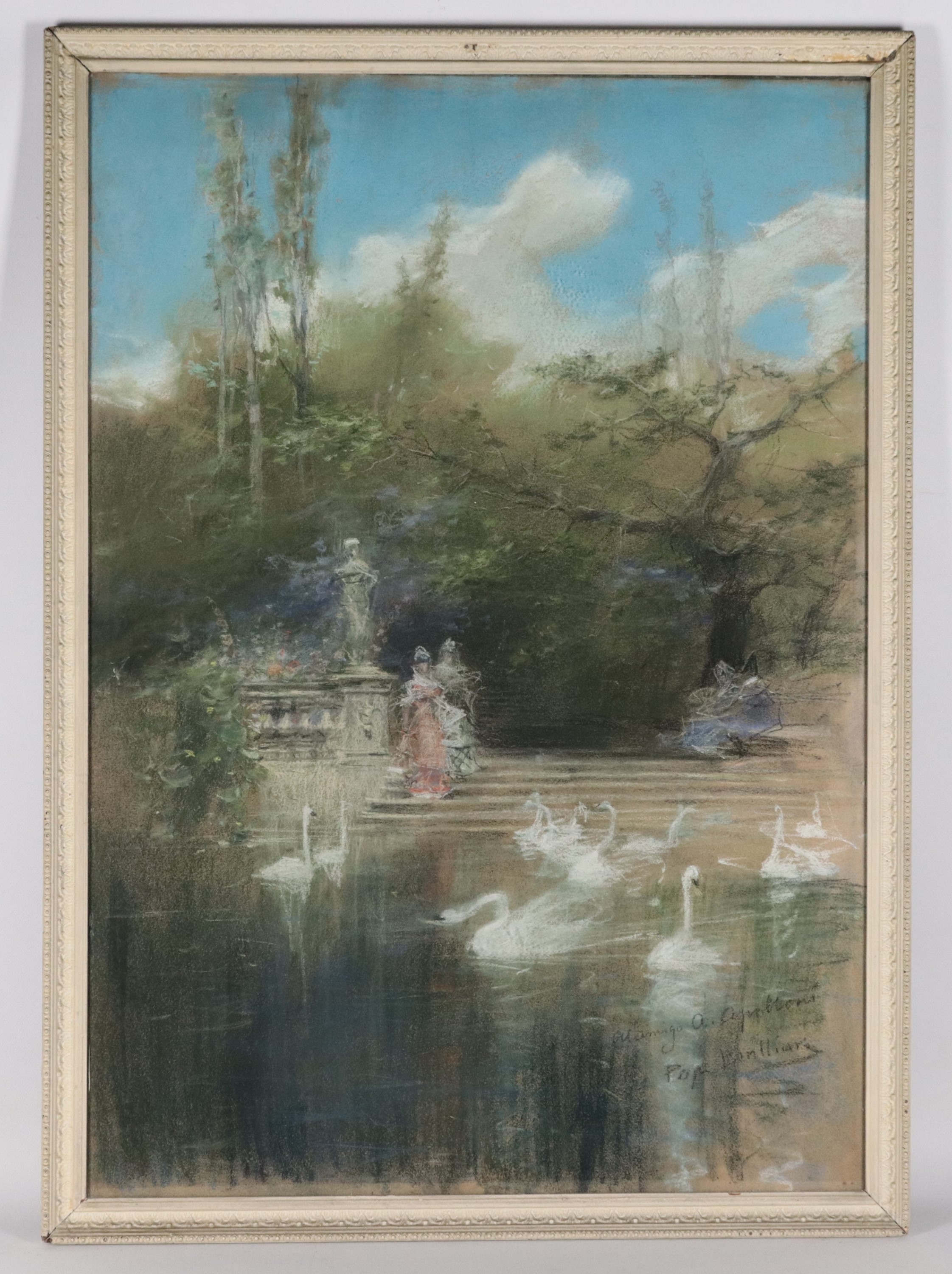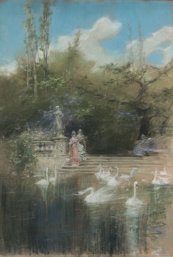 Signed with dedication. "View of a villa park with a pond, noblewomen, and swans."