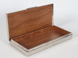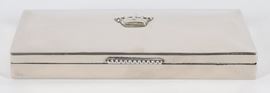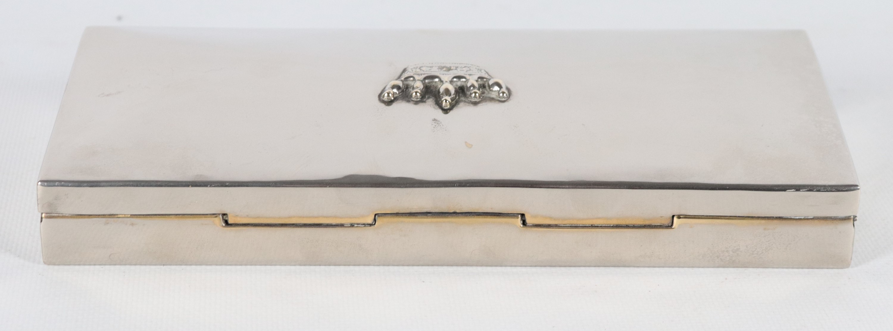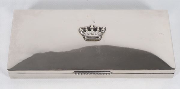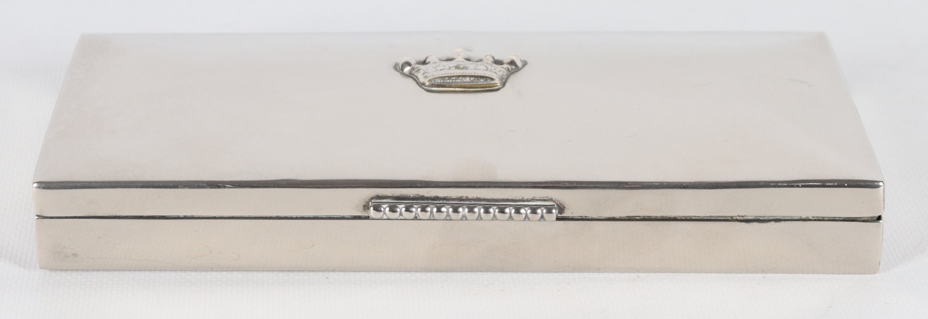 Cigarette box made of wood covered in silver metal, with a patrician crown on the lid
