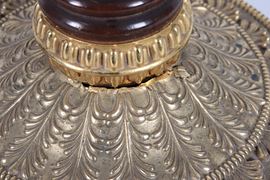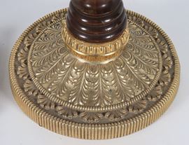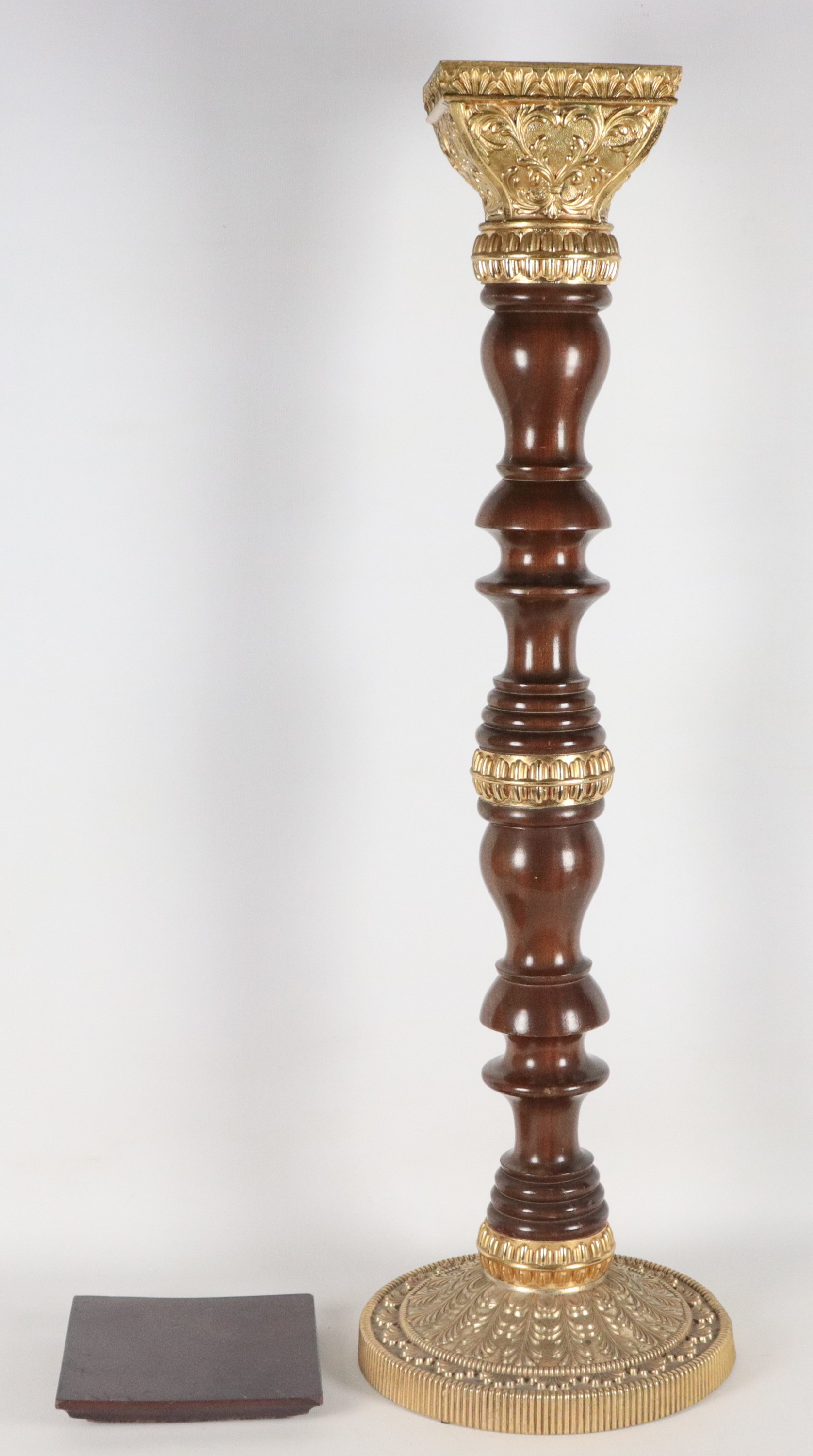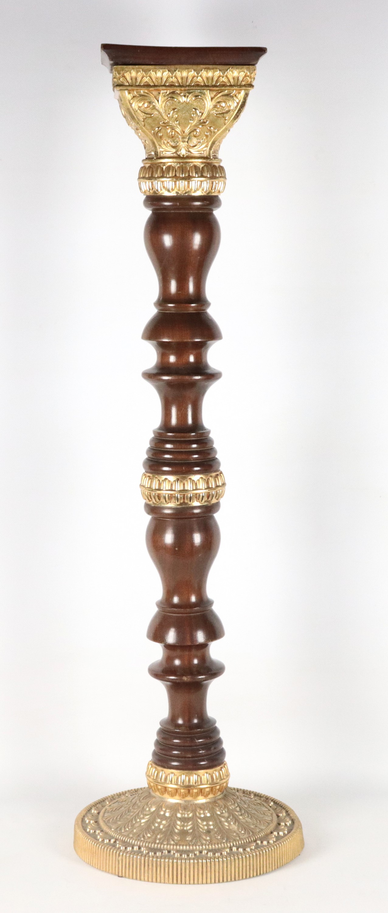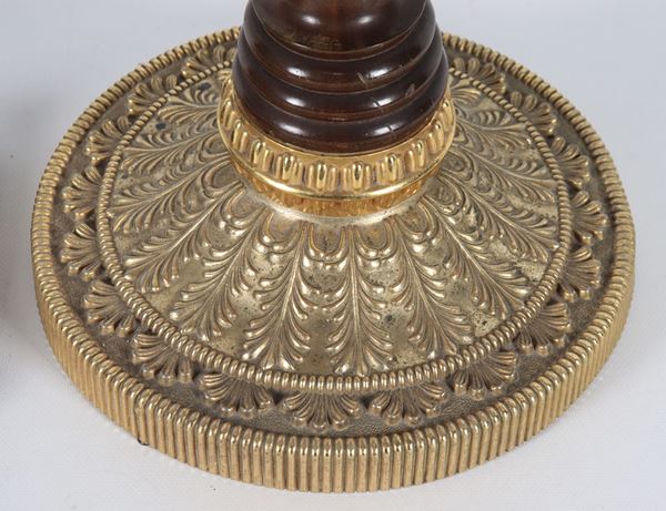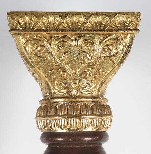 Column in turned wood with base, capital and decorations in gilded bronze, embossed and chiseled
