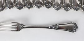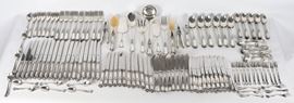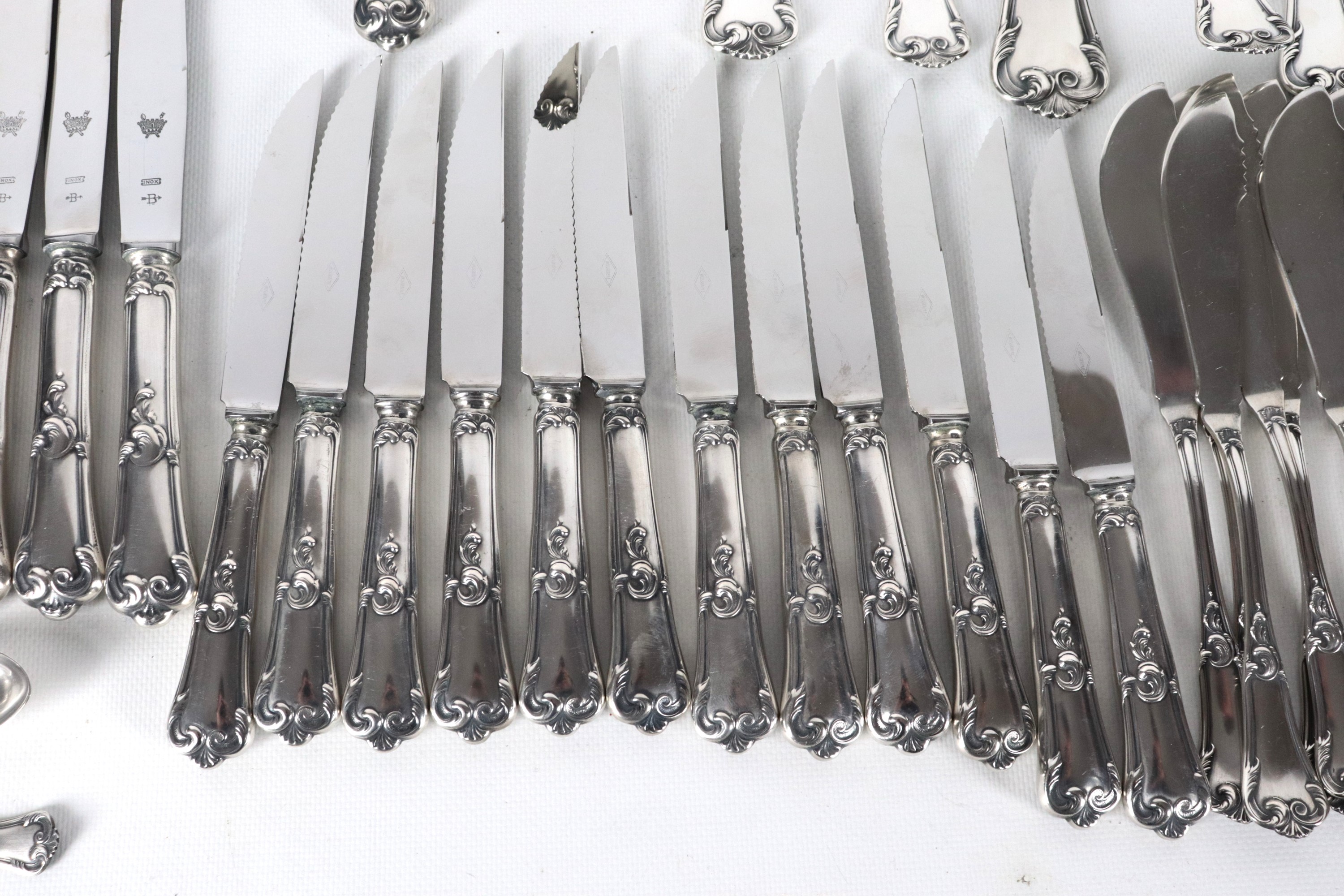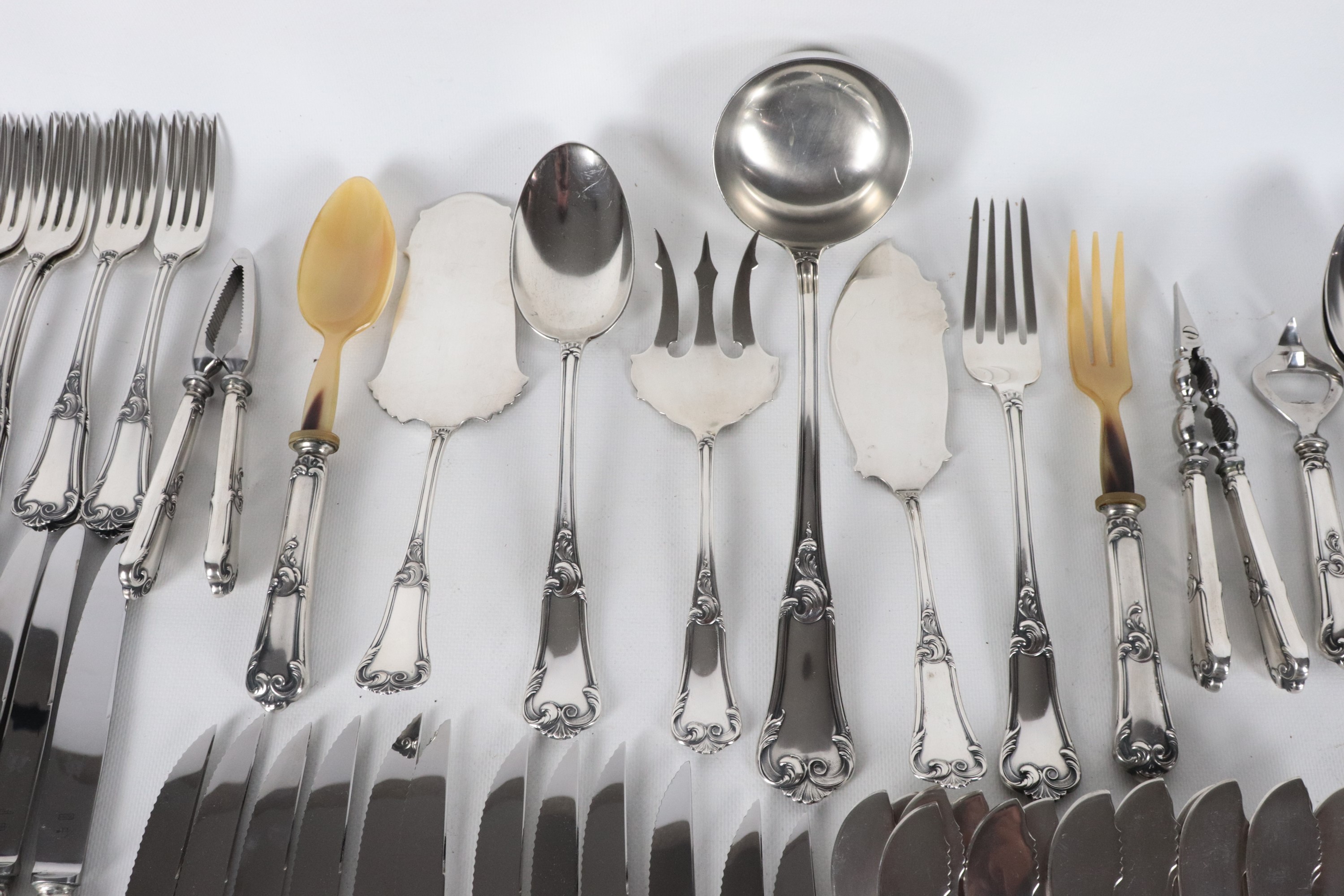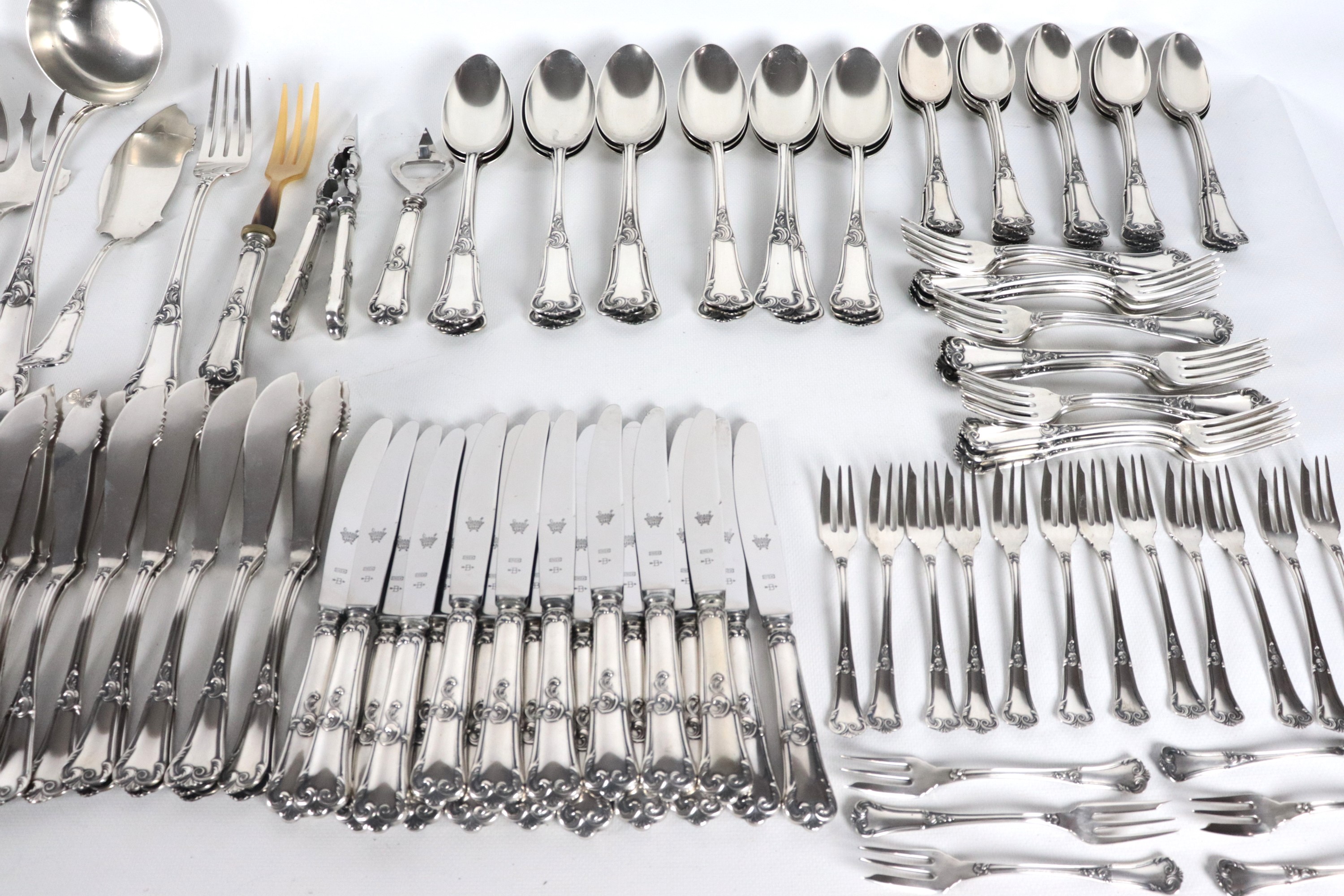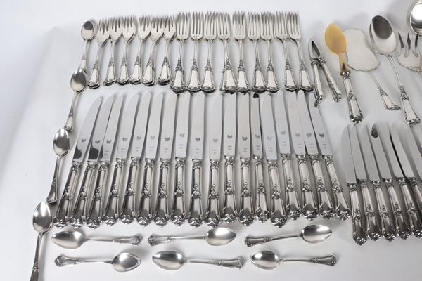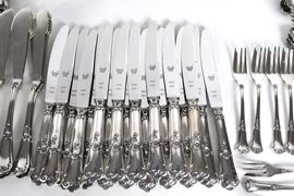 18 large spoons, 18 large forks, 18 large knives, 12 carving knives, 18 fruit spoons, 18 fruit forks, 18 fruit knives, 18 fish forks, 18 fish knives, 1 ladle, 1 serving spoon and fork, 2 fish serving servers, 2 salad serving servers, 1 cake server, 1 nutcracker, 1 bottle opener and 1 shellfish tongs.