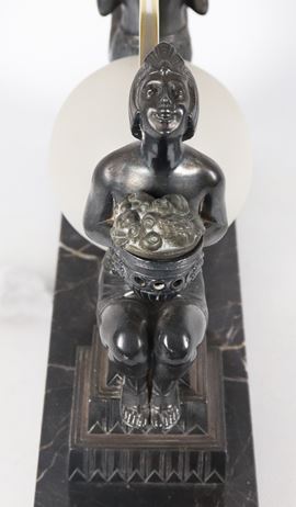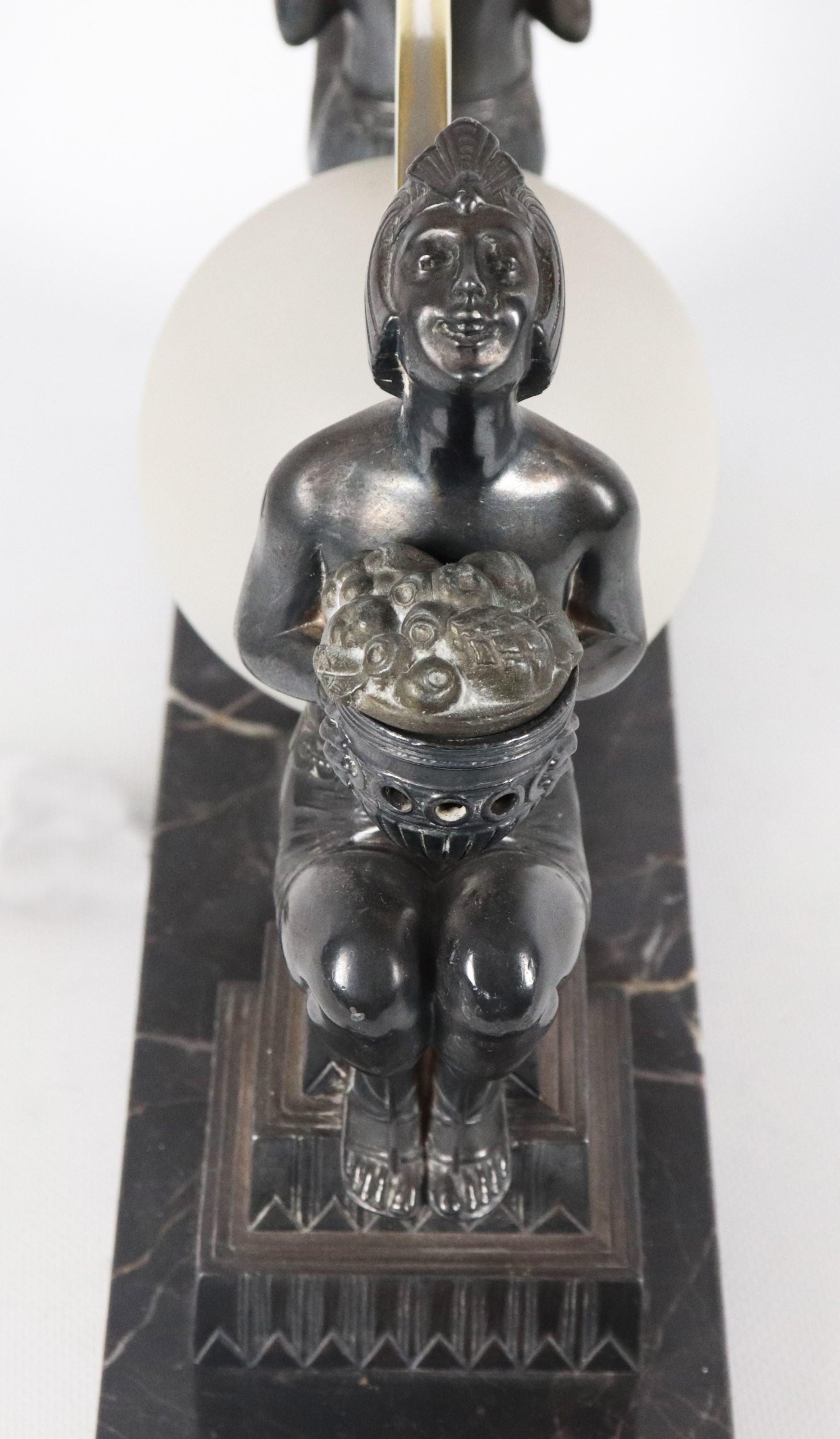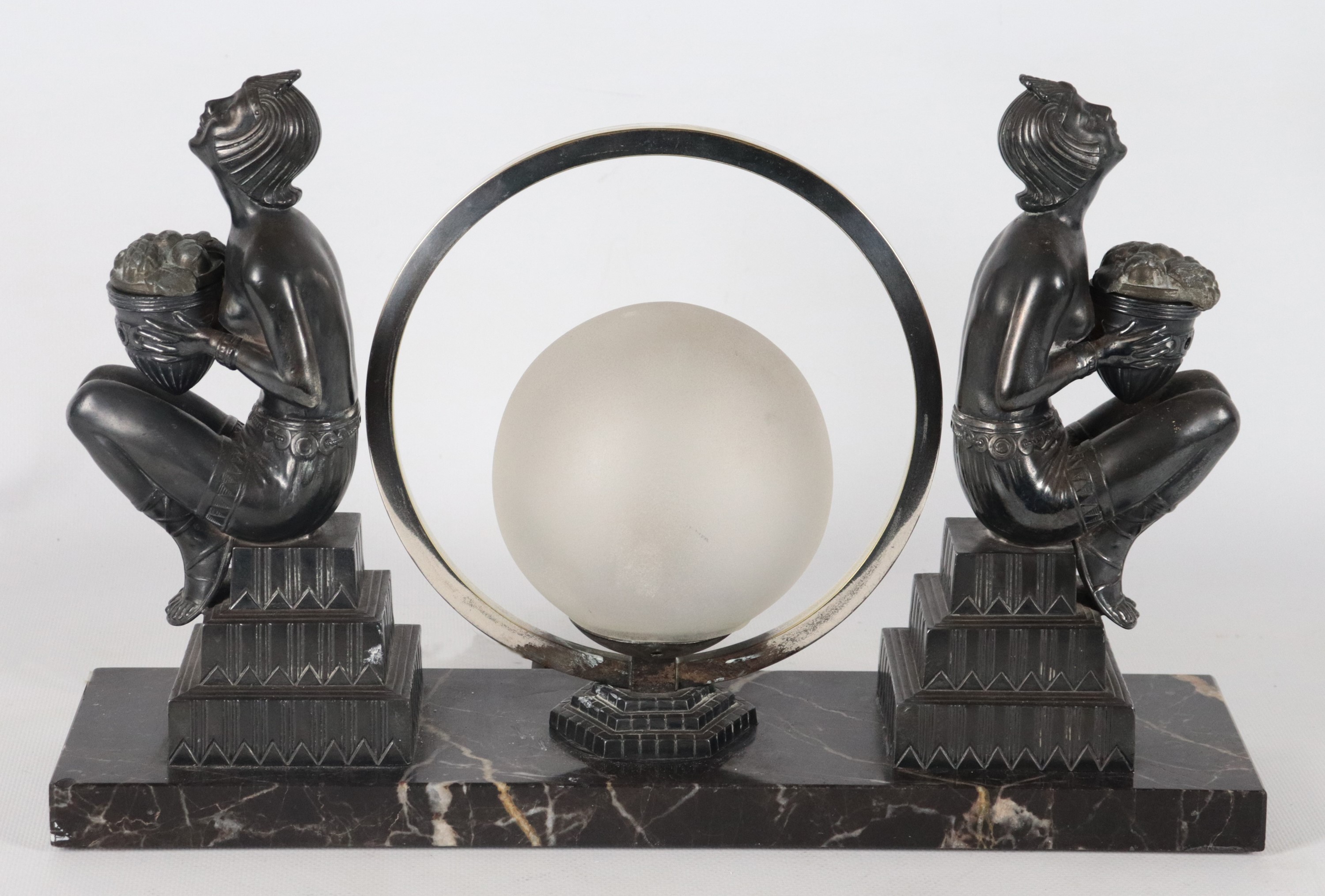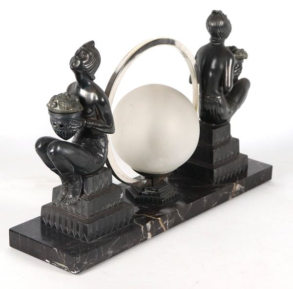French Art Nouveau table lamp, made up of two bronze odalisque sculptures with a small milk glass globe and silvered circle in the centre, marble [..]