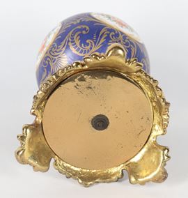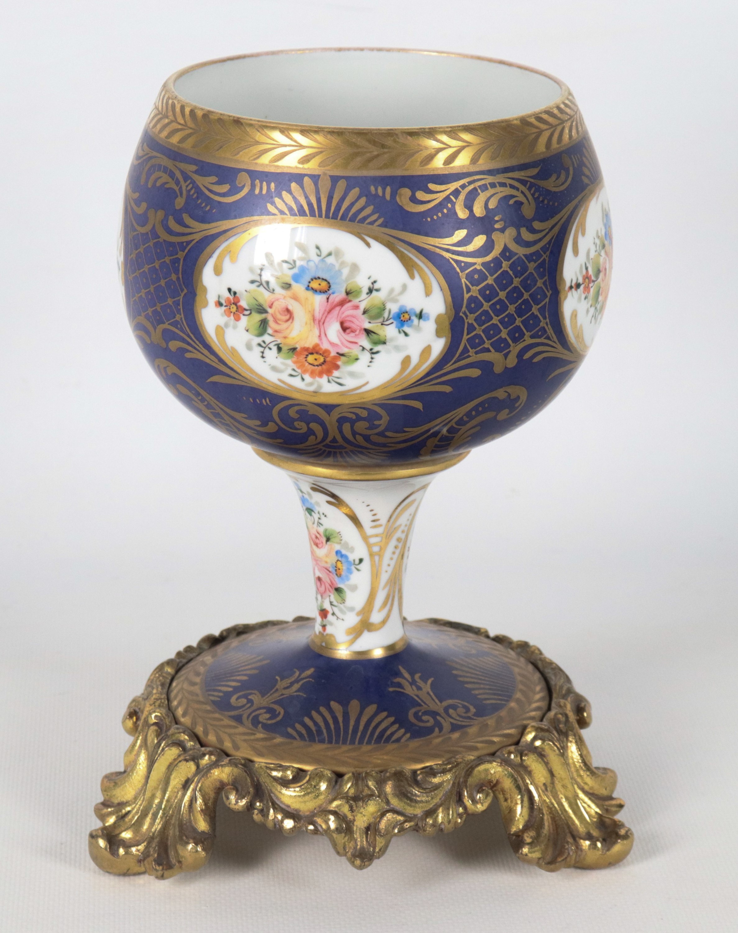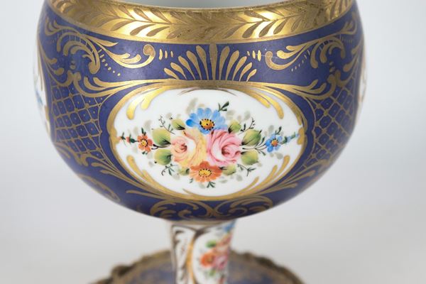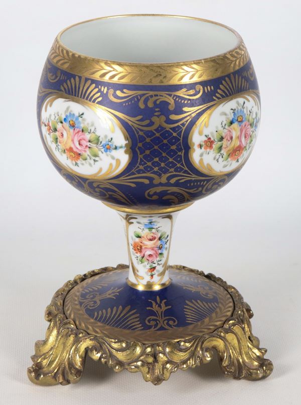 French blue and white porcelain cup, with polychrome decorations featuring medallions of bunches of flowers and highlights in pure gold, gilded [..]